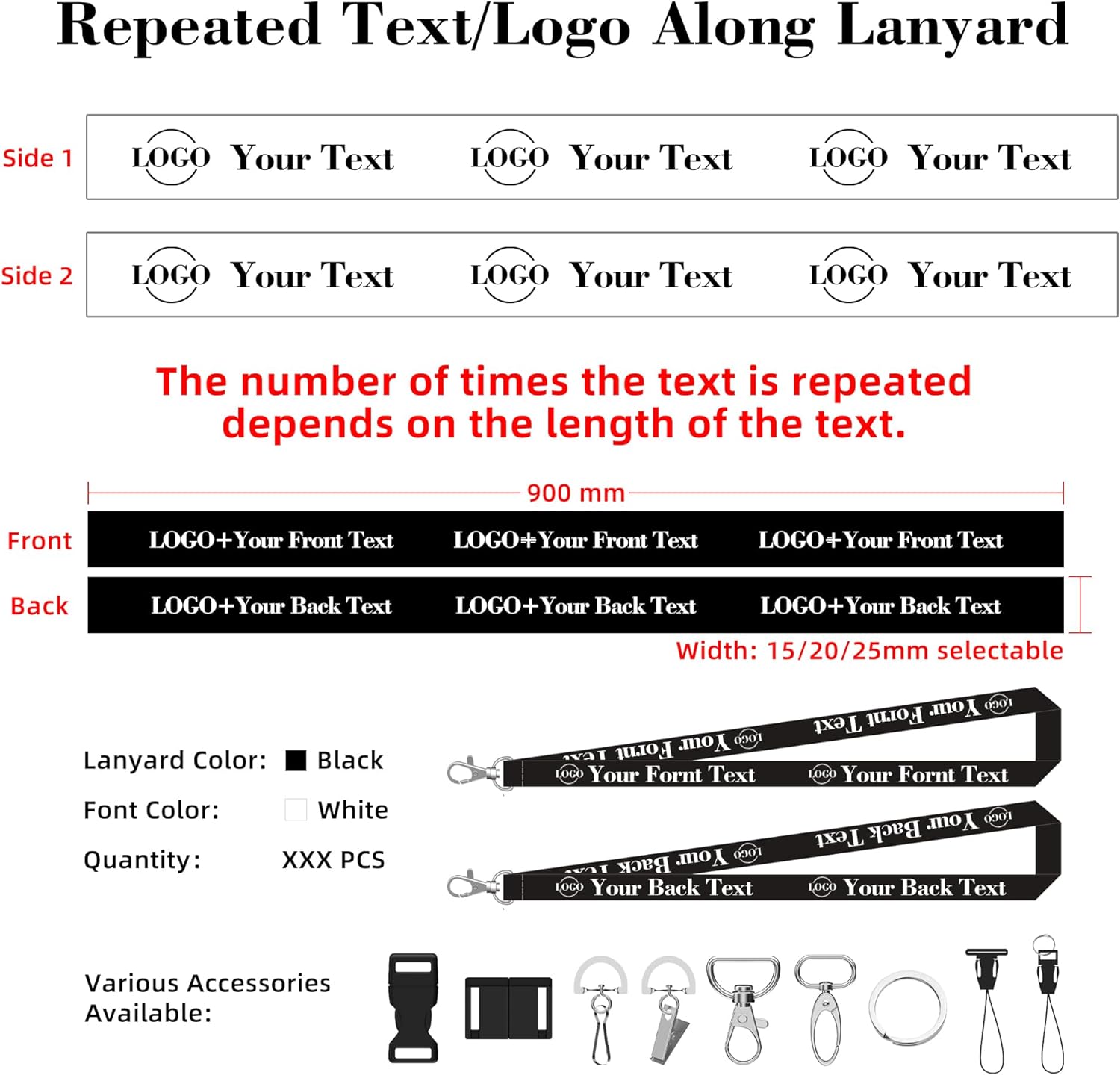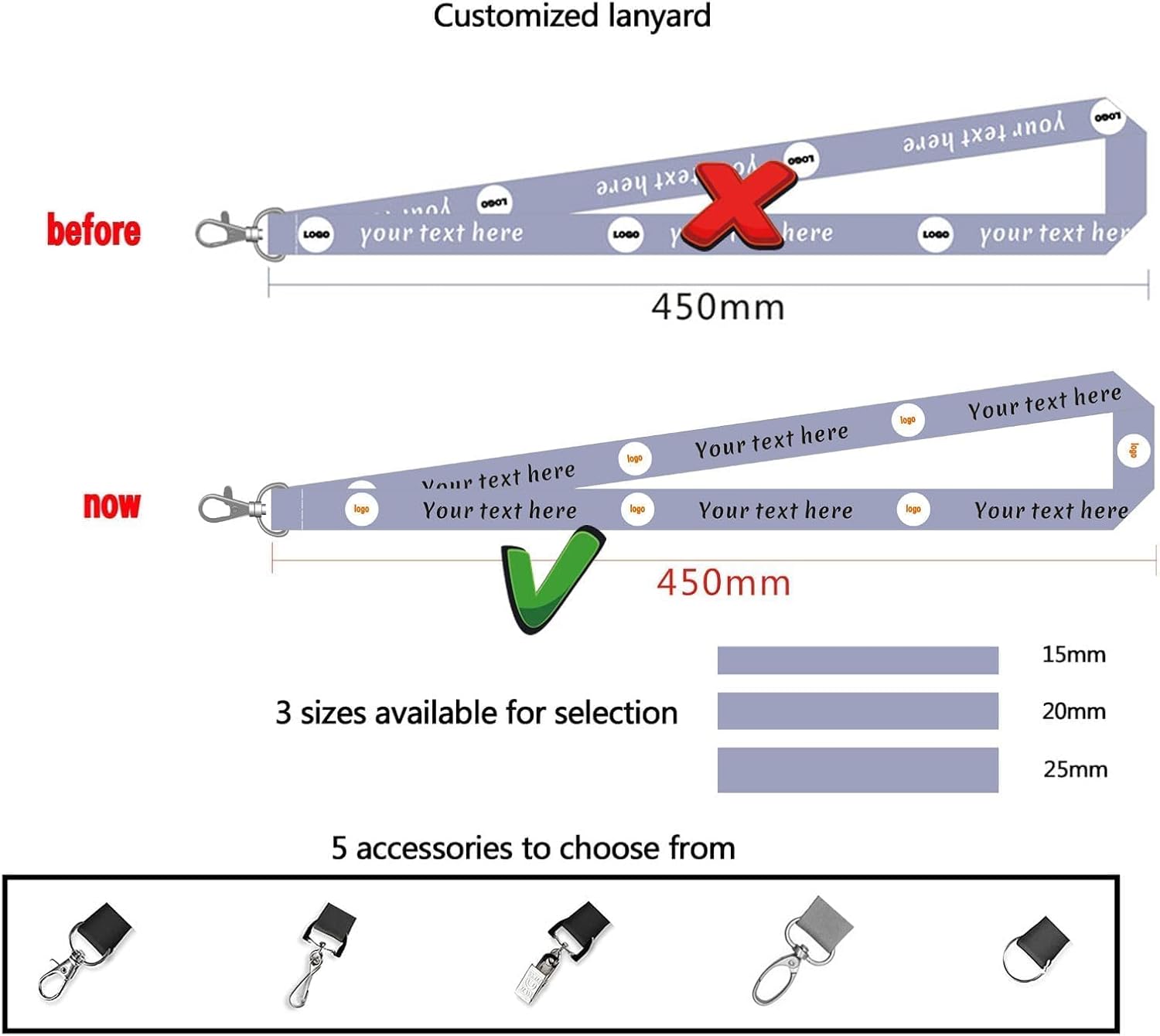 - 【Customization and Printing】: You can customize the text/name/logo/clipart on the hanging rope, such as company logos, event slogans, personalized patterns and more. For better printing results, please upload clear images, and we will arrange for a reasonable layout design.