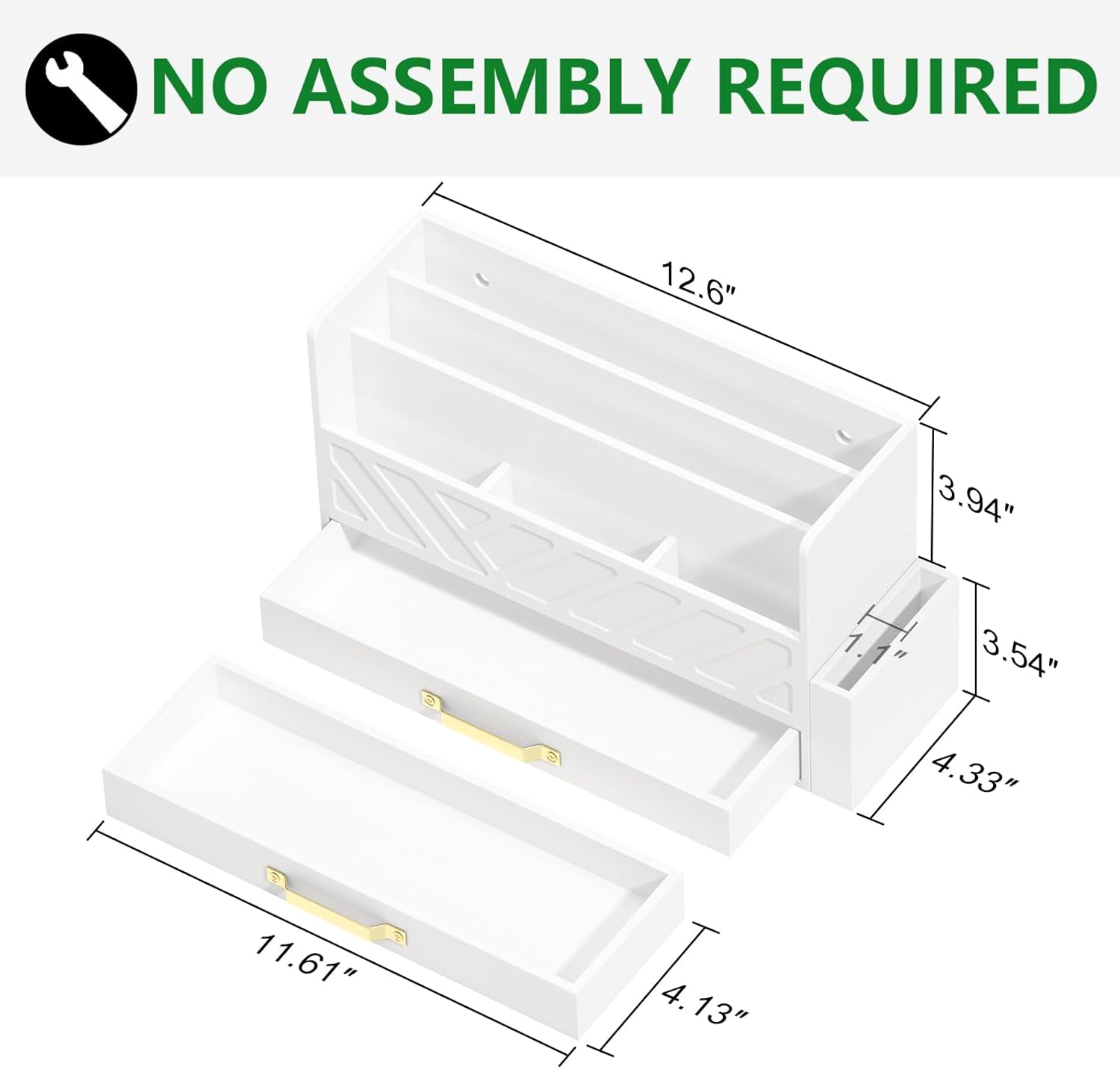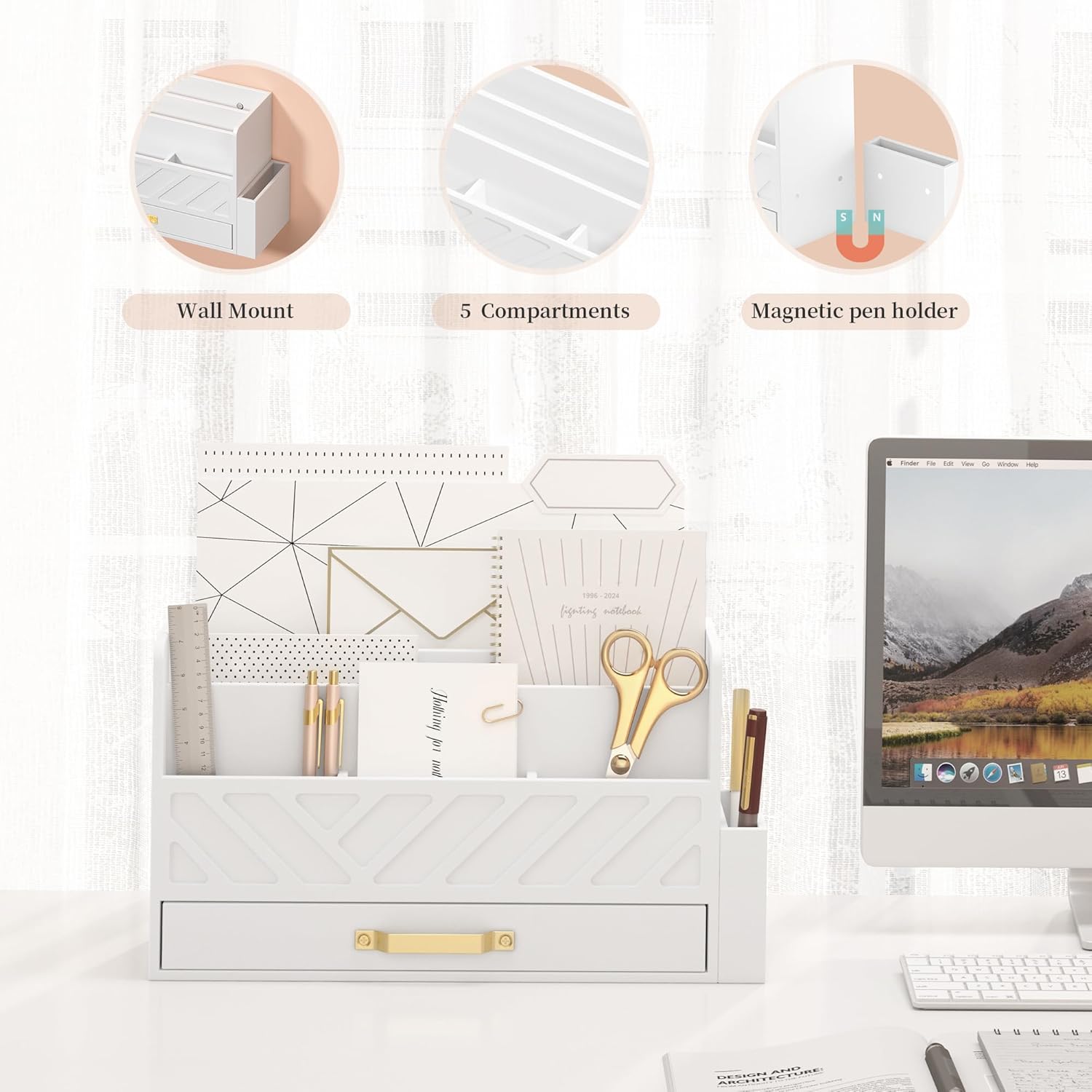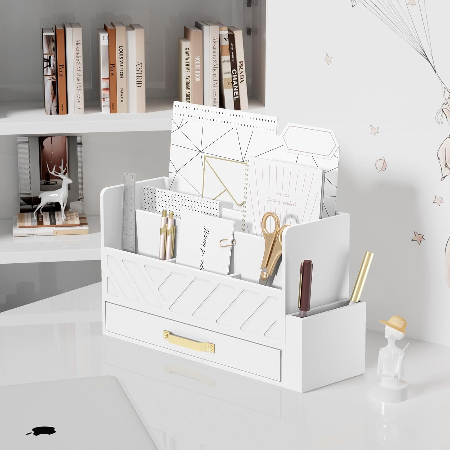 Bamboo Desk Organizer Mail Holder Countertop Wood Desk Drawer Tabletop Storage Box Pen Holder Letter Sorter Makeup Organizer for School Home Office Supplies with Pen Holder White