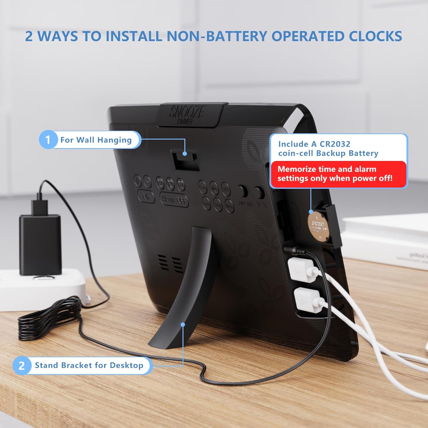 - EASY TO SET - This digital Clock is very easy to set, with 2 USB ports and a snooze function, so you can charge your phone and other electronic devices while you snooze. This alarm clock only supports power cord use, but used with a built-in backup CR2032 coin-cell battery( Before use, PLEASE REMEMBER to REMOVE the Plastic Tab in the Battery Compartment) together will be more reliable, it can backup time and settings in a power surge or blackout.