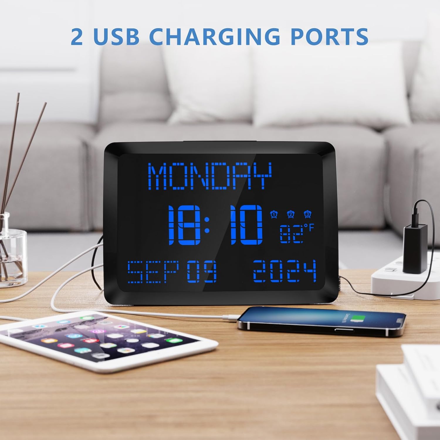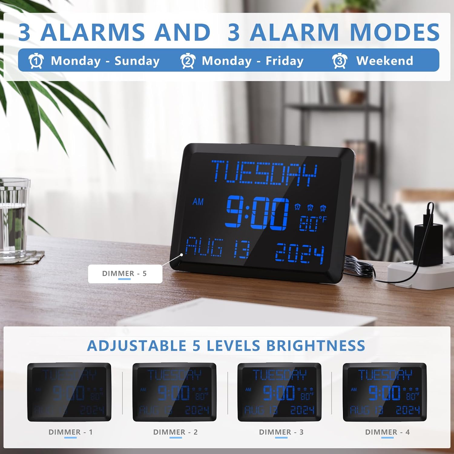 - MULTI-FUNCTION USE -The digital alarm clock is packed with a ton of different capabilities including indoor temperature,DST,2 USB charging port,3 different alarms and 5 adjustable diming.This alarm clock can display the date and the day of the week,easy-to-read LCD display.Adjustable dimming and brightness options allow you to find your own ideal display settings.