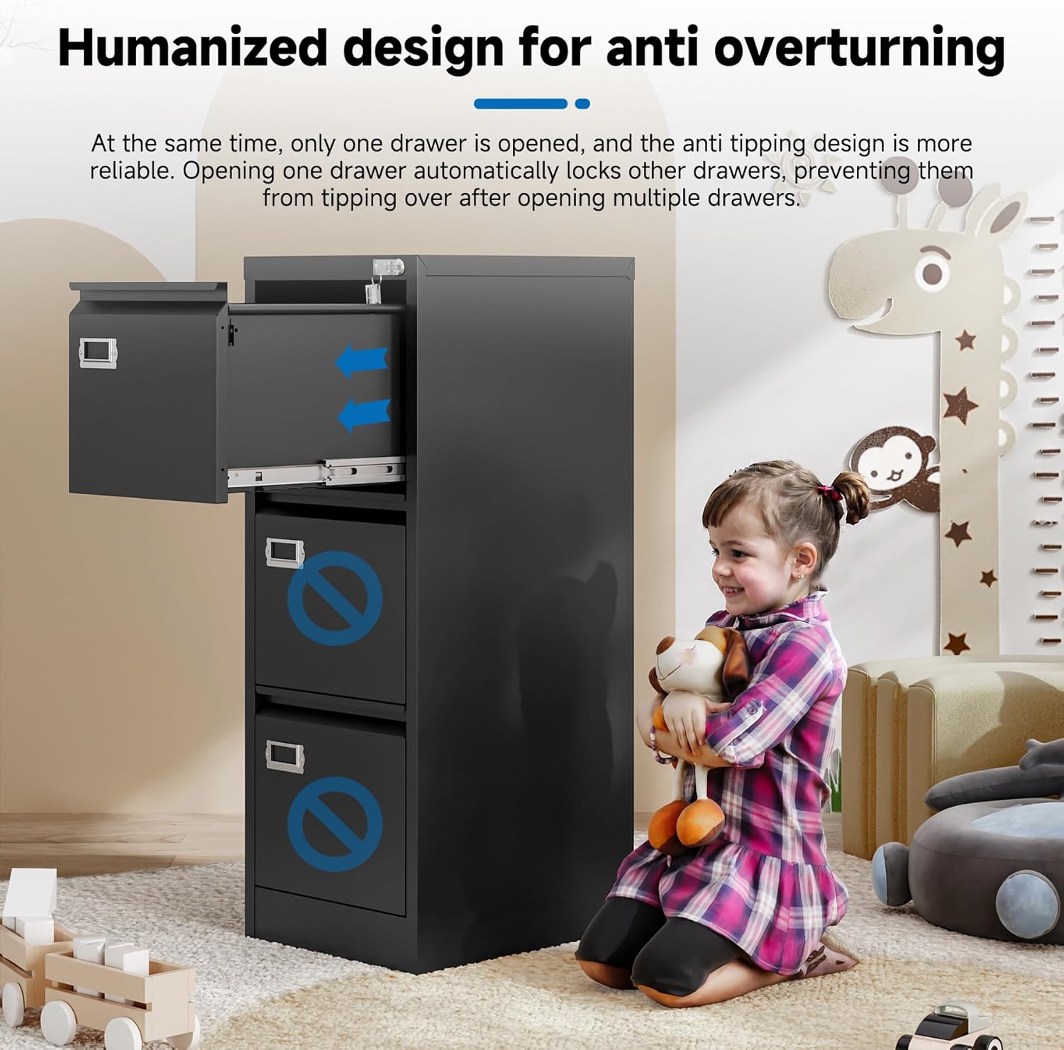 - ăHIGH SECURITYăThis file cabinet can lock 3 drawers at the same time with one lock, and is equipped with 2 keys. With an anti-tilting mechanism, when 1drawer is opened, the interlocking system prevents the other drawer from opening, thereby preventing tipping and protecting your safety.