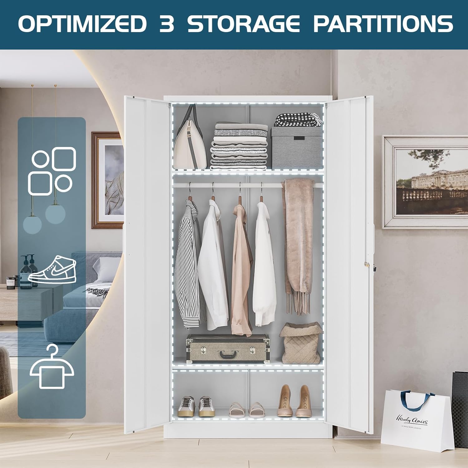 - 【Sturdy & Durable Steel Wardrobe】This garment storage cabinet is constructed with premium 24 gauge cold rolled steel, which provide long using life. Powder-coated finish protects it from water and rust, resistant to scratches. Each shelf can hold up to 80 pounds and the hanging rod holds up to 100 pounds.