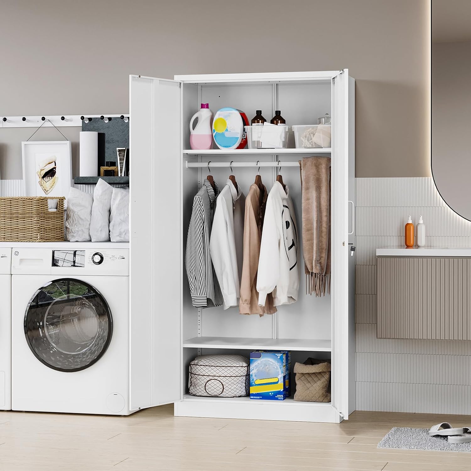 - 【Add Security】Furnished with two locking doors and 2 keys, it ensure the security of your clothes, files and personal belongings. Two magnetic doors can keep this cabinet close and prevent accidental opening. The leveling corrector screws on cabinet bottom also add to the safety, even on uneven ground.