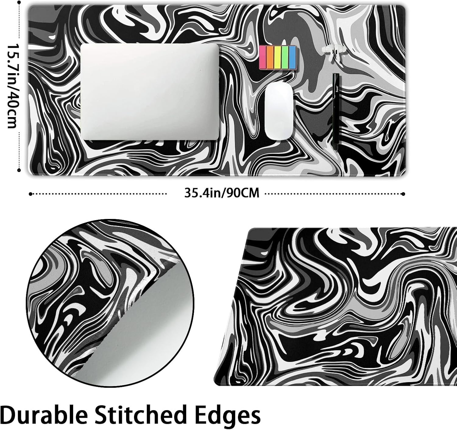Black White Swirl Gaming Mouse Pad XXL Gray Marble Grey Fluid Design Extended Large Mouse Pad Big Desk Mat Non-Slip Rubber Base Stitched Edge Long Mousepad for Desktop Office Desk, 35.4 x 15.7 in