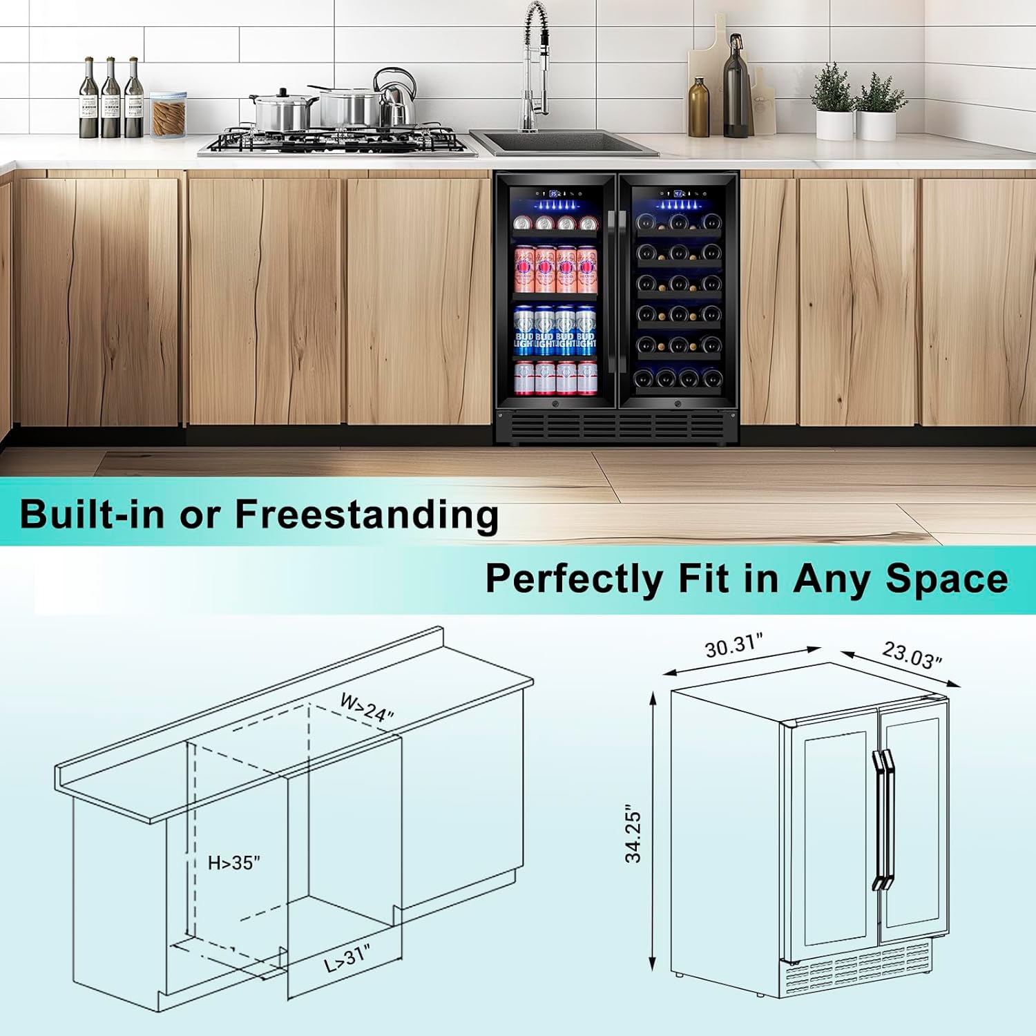 - Dual-Zone Cooling for Wine & Beverages: Enjoy perfectly chilled drinks with Velieta’s independent 30 inch dual-zone wine and beverage fridge. The left zone (35°F–50°F) keeps beverages icy cold, while the right zone (41°F–64°F) preserves wines at their ideal serving temperature. Savor every sip at its best