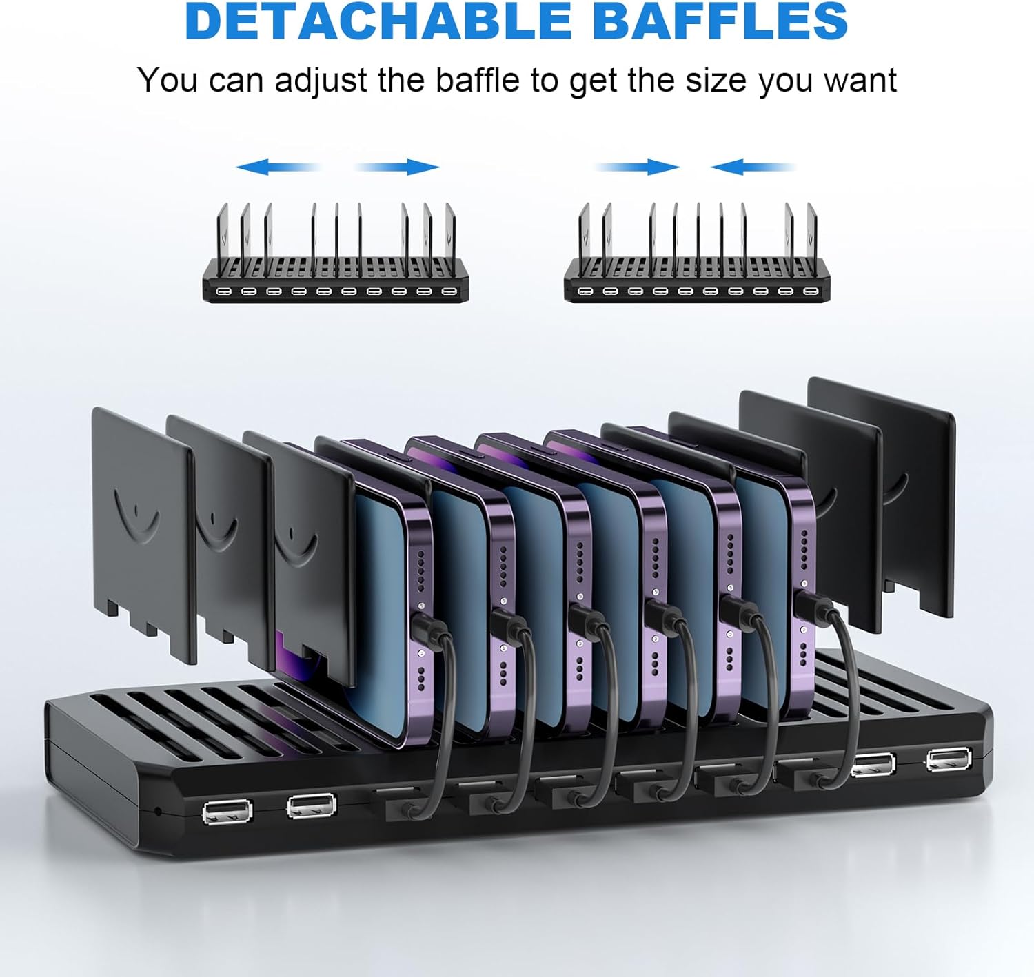 - ăNeat and Organizedă60W 10-Port USB Charger Station Organizer can charge up to 10 devices simultaneously in one place. The adjustable dividers easily adjust the width to fit your needs, even large tablets with thick cases. Take the hassle out of cluttered cables, keep your desktop neat and organized, and make room for outlets. Note: NO CORDS!