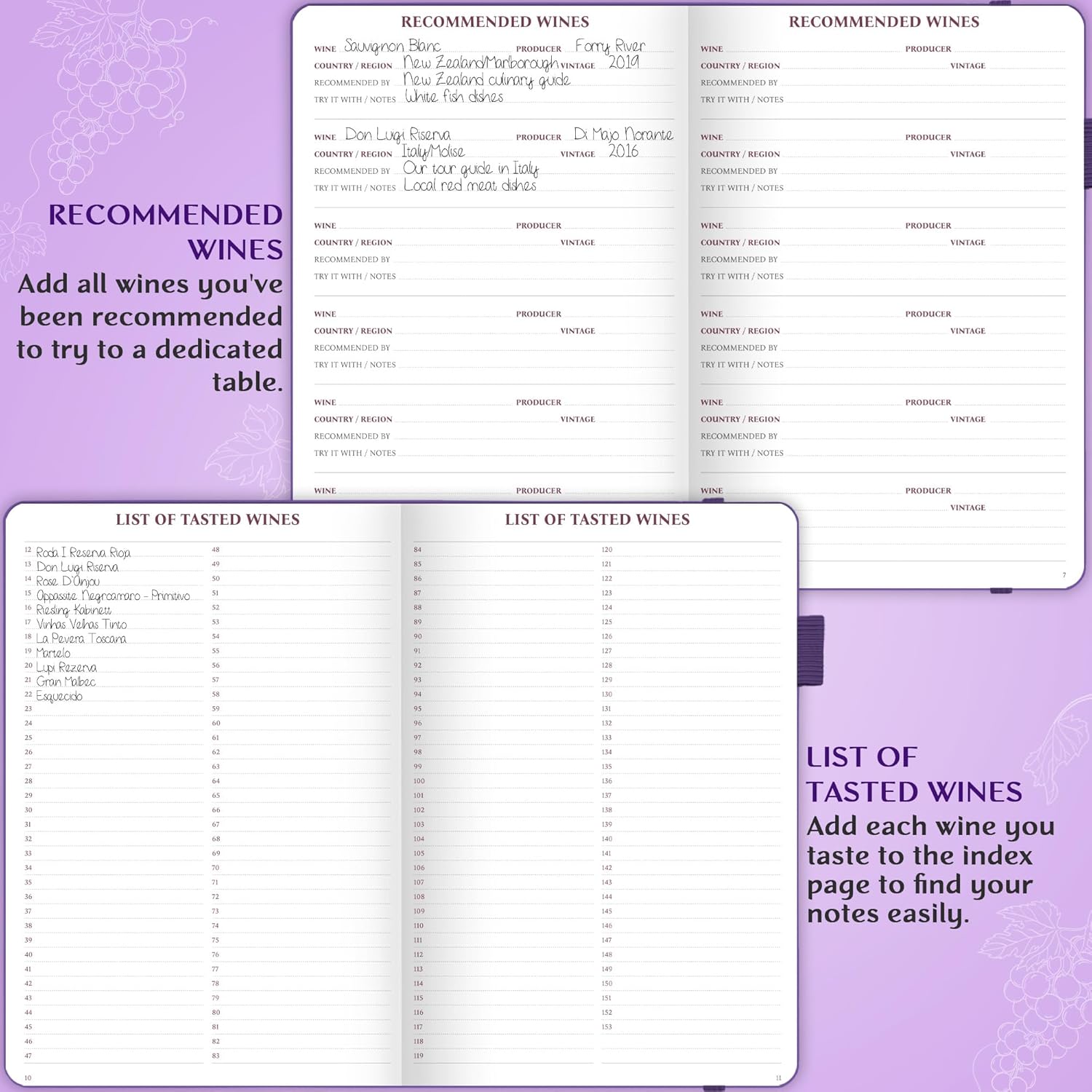 - KEEP DETAILED & ORGANIZED TASTING NOTES – The wine tasting book includes space for 142 wine reviews, allowing you to record all essential details, from the wine’s name and origin to its unique characteristics, along with your personal rating and remarks.