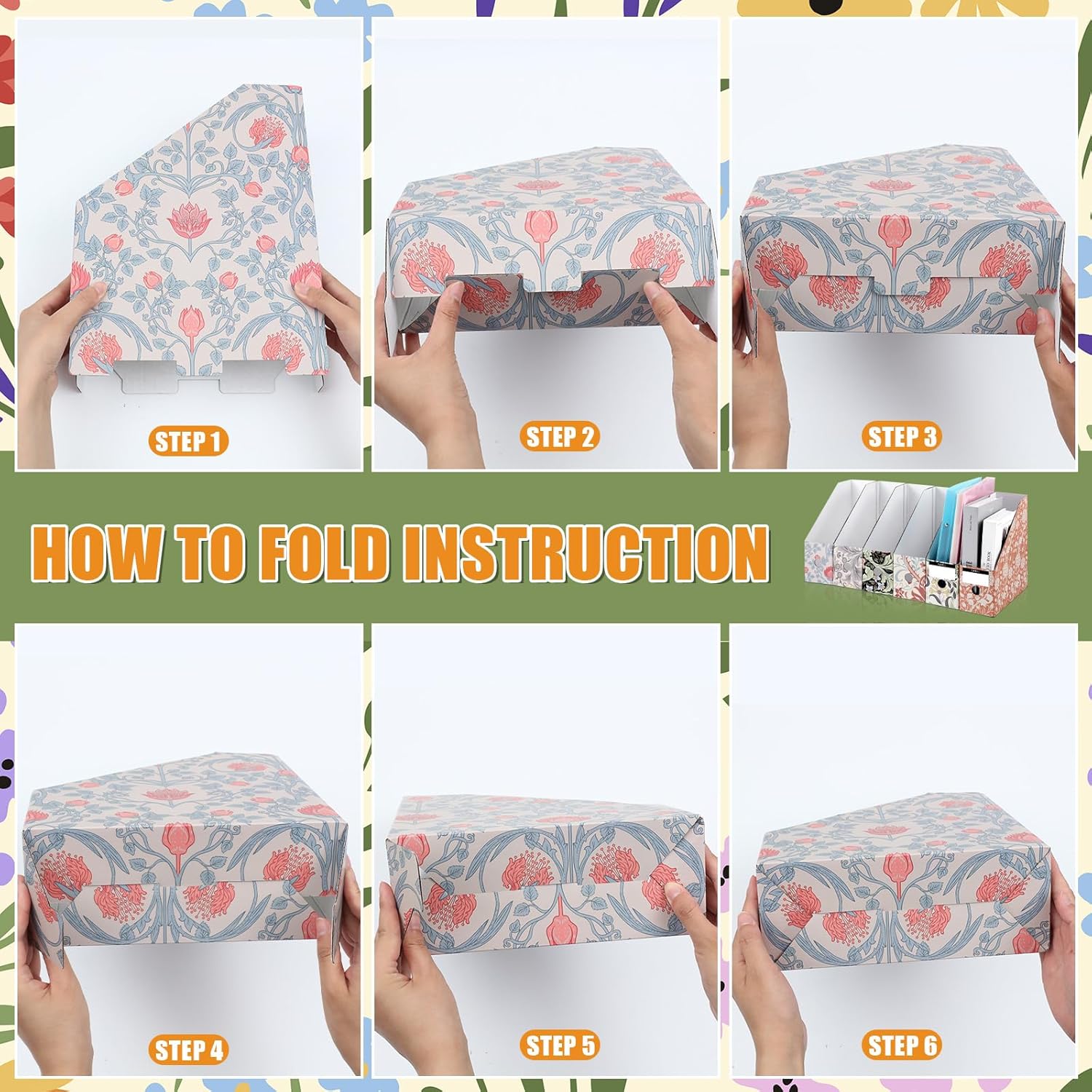 PerKoop 6 Pcs Magazine File Holder Foldable Decorative Cardboard File Folders 6 Patterns Floral Colored Magazine Rack with Printable Sticker Labels for School Office Home Desk (Floral)