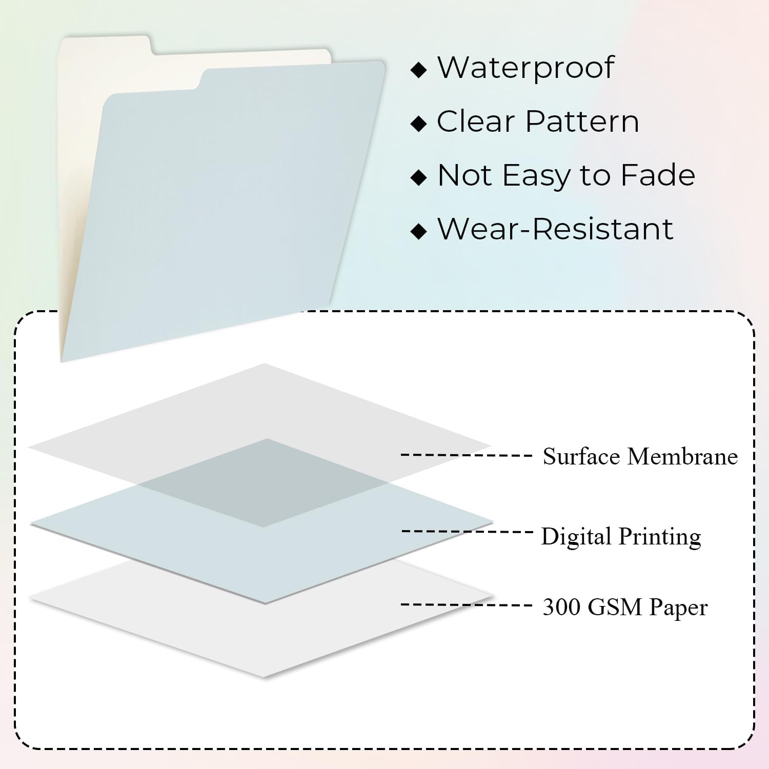 - Heavyweight Material - Decorative file folders are made of 300 GSM recycled paper. Surface membrane technology makes the digital printing pattern of pretty file folders not easy to fade, waterproof, and more wear-resistant