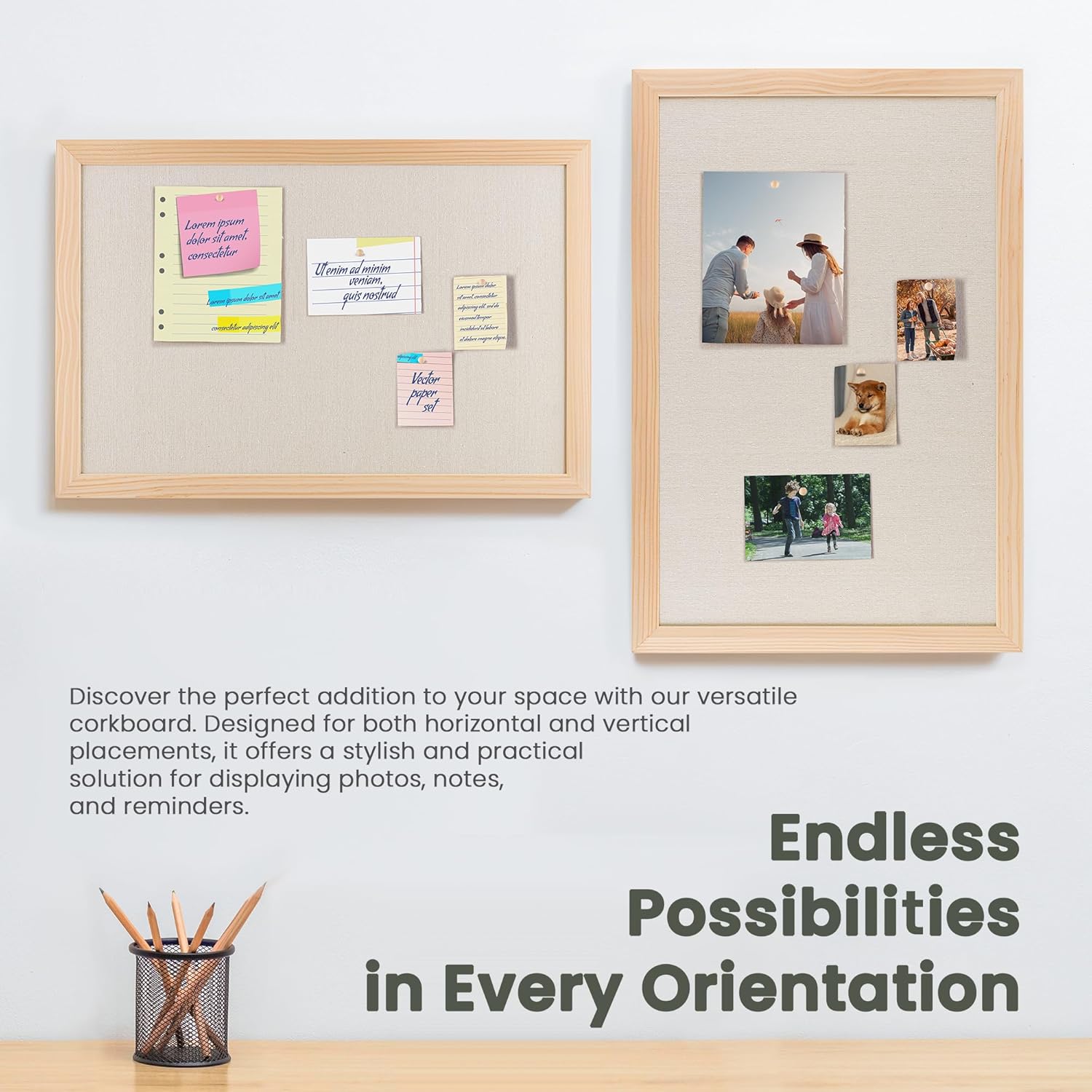 Bulletin Board Cork Board with Linen, 100% Wood Framed 30" x 20" Bulletin Board Decorations, Pin Boards for Walls, Wall Mounted Fabric Picture Board with 10 Pushpins for School, Home & Office, Natural
