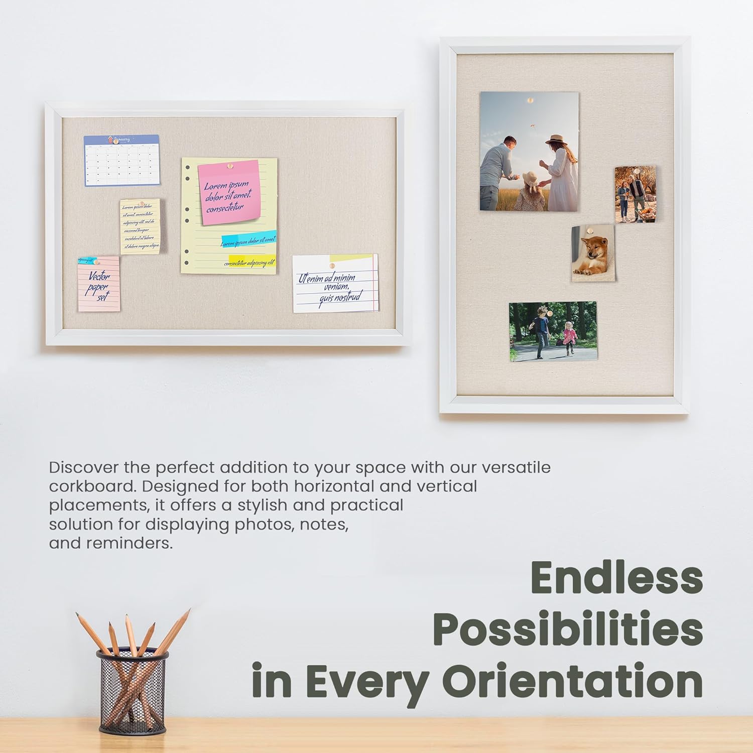 - Premium Solid Wood Frame: Cork board with a solid wood frame measuring 1.38" in width. This sturdy construction ensures durability and longevity, providing a reliable display solution for your photos, notes, and reminders. Its elegant design adds a touch of sophistication to any space, making it a versatile and stylish addition to your home or office decor.