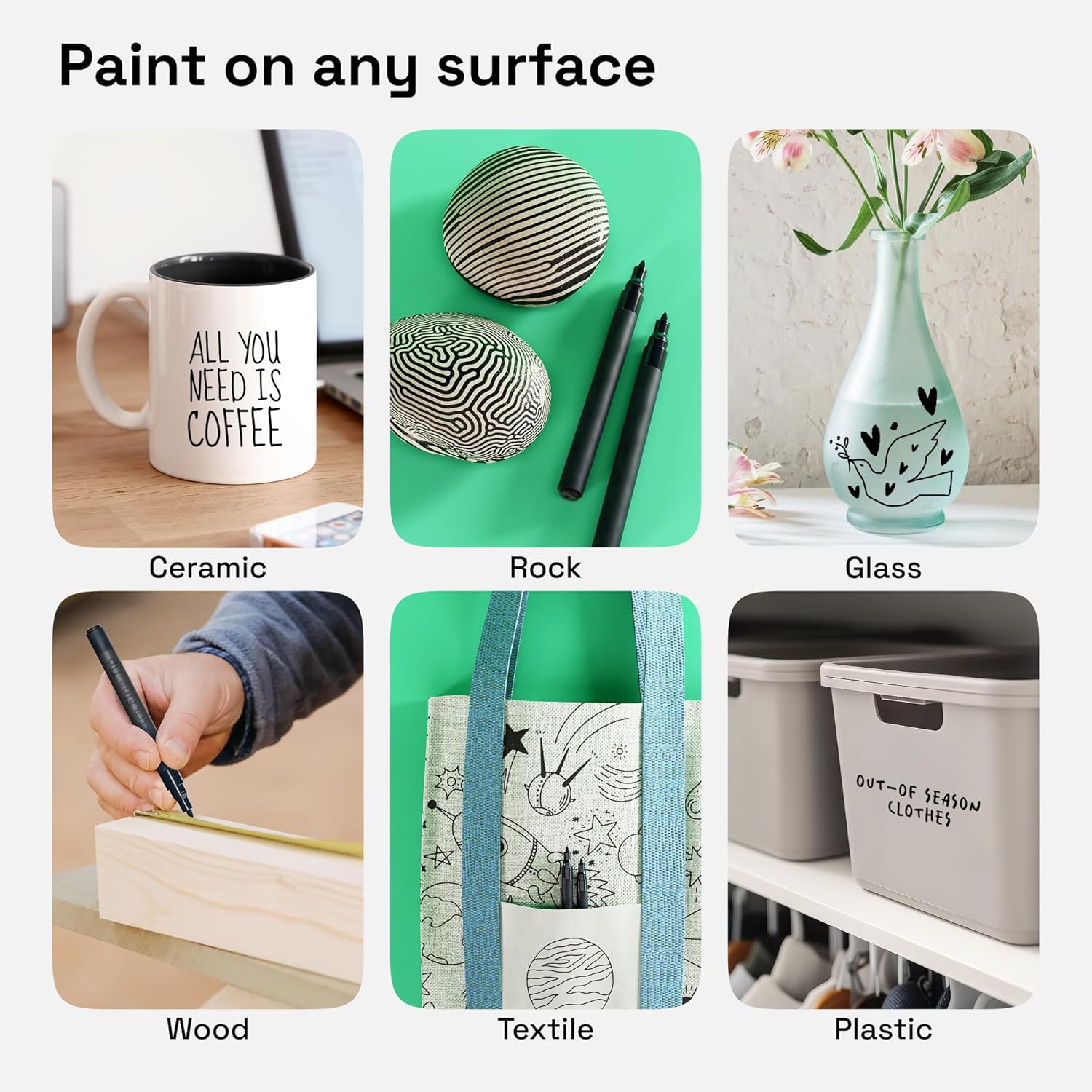 - Multiple Surfaces: Use these oil paint pens as oil markers for plastic and glass or as oil based fabric markers for clothes. Each black pen is water-resistant. They’re also good for leather, vinyl, or epoxy resin. And the nibs are solid, even on rocks!