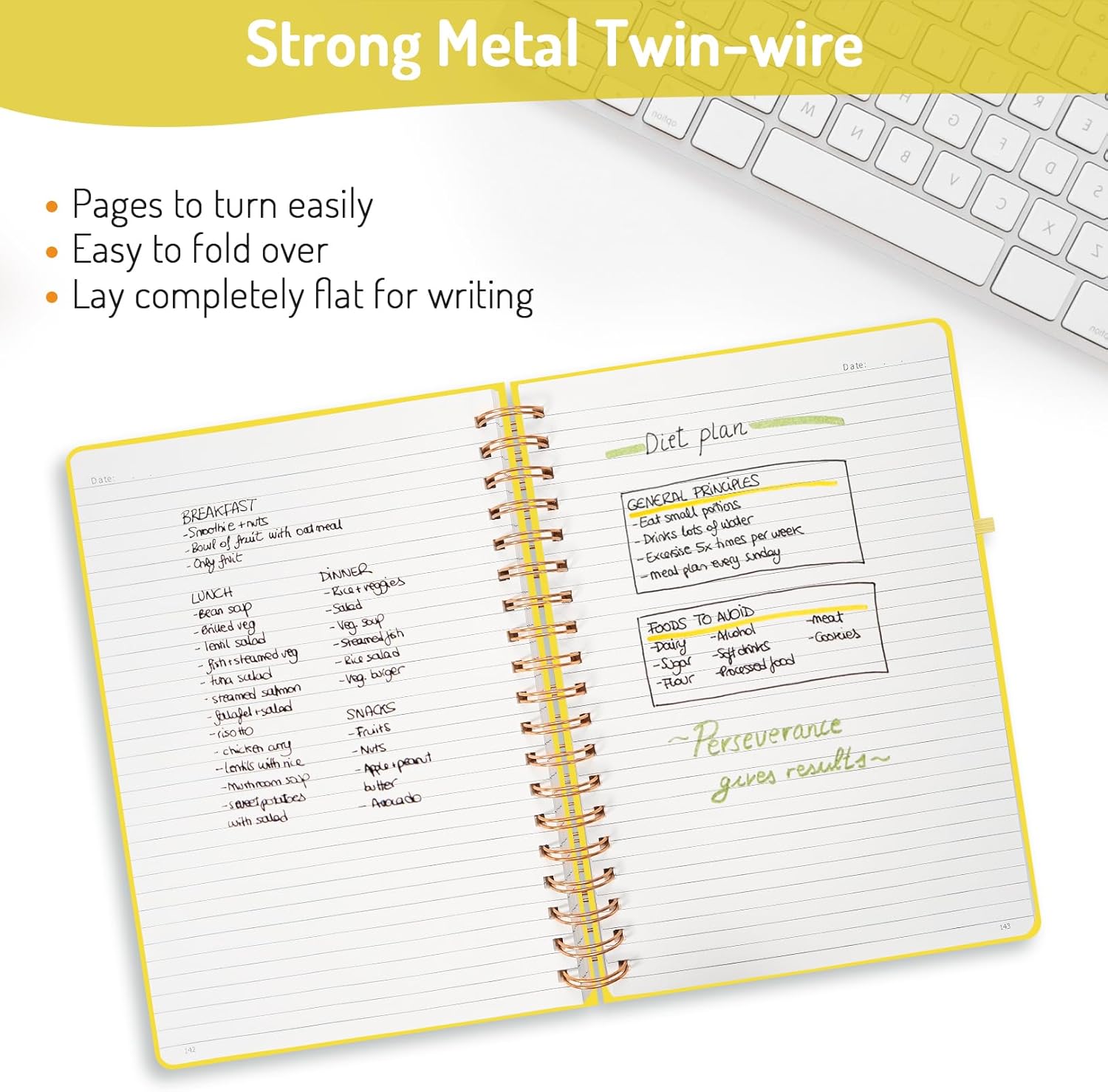 - Strong Metal Twin-wire: Feature a super durable Golden double wire spiral binding with heavy-duty hardcover; making it easy to fold over and laying the notebook totally flat easily, giving you a better writing experience. The Professional durable hardcover will protect your journal to last for years. Product Dimensions: 11 in (L), 8.5 in (W), 1.0 in (H).