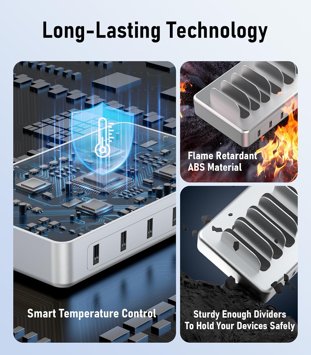 - ăSpecial DesignăThe usb charging station is in a premium silver colour. The nightstand charging station is designed with two width slots, three are 0.75 inches and the remaining three are 1 inch. The slots of different widths can accommodate different-sized equipment.It's sturdy, and not easy to collapse