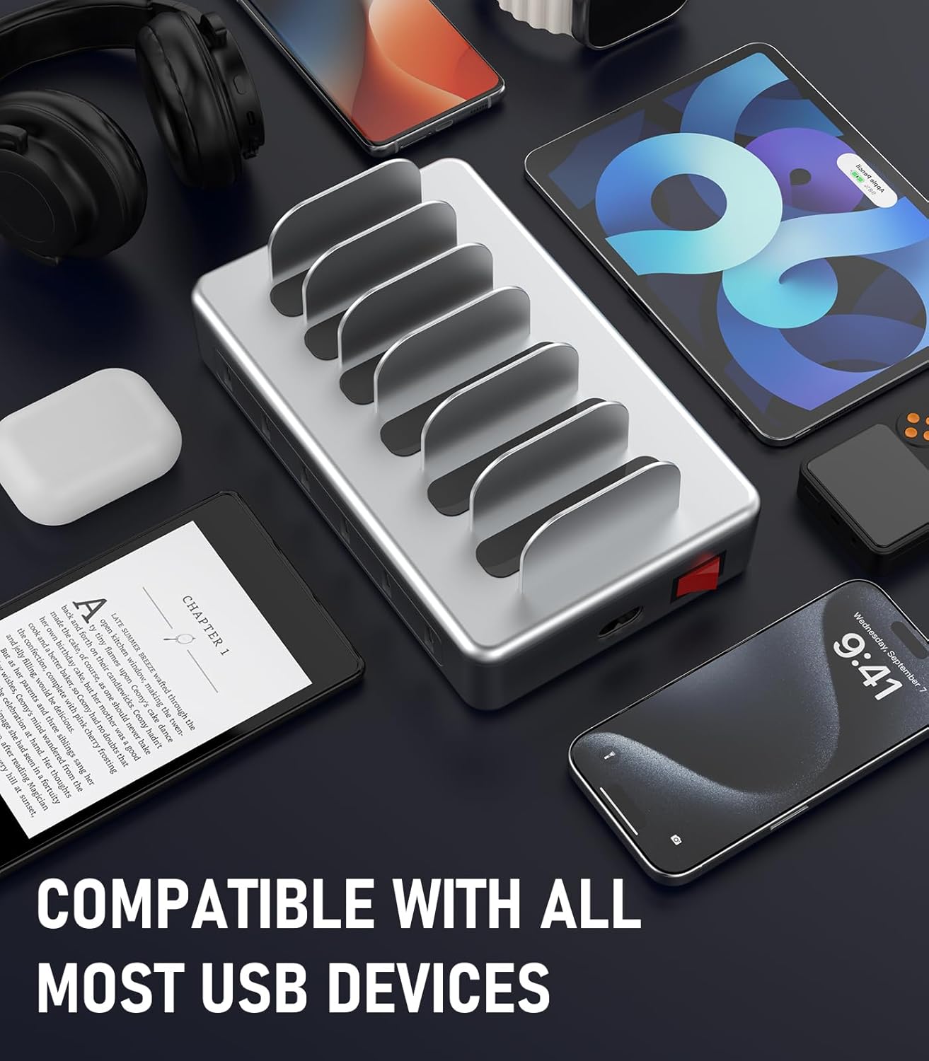 - ăMulti-Device CompatibilityăThe iphone charging station comes with 6 short cables and a Type-A to Type-C Adapter Converter, which is compatible with most usb devices for charging. CREATIVE DESIGN charger station keeps your devices nicely organized in a row, and there are no more adapters and tangled cords everywhere