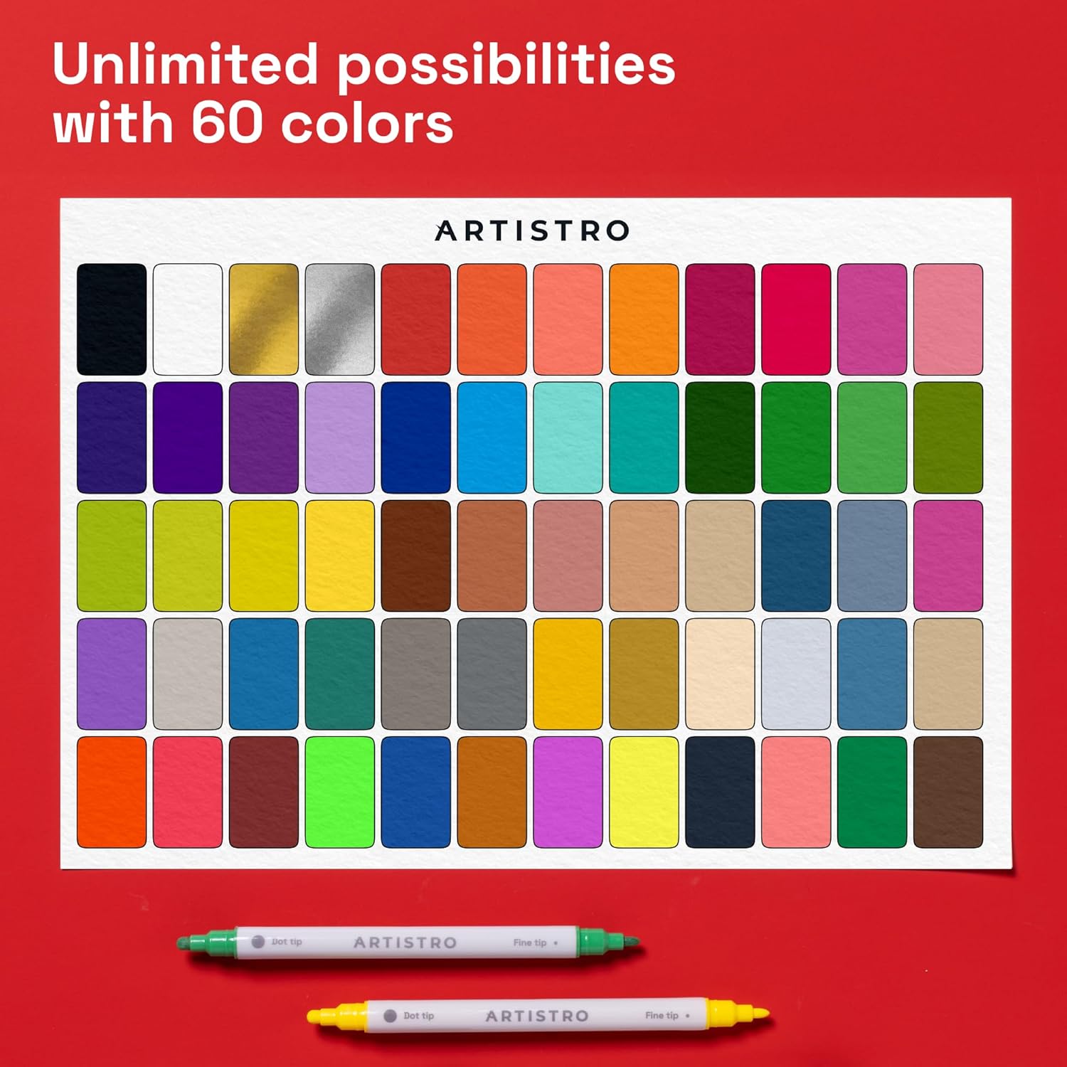 ARTISTRO 60 Dual Tip Fabric Markers - Acrylic Drawing Markers for All Ages & Levels - Fabric Paint Pens for Personalizing Clothes, T Shirts, Bags, Canvas, Textiles (Brush + Fine)