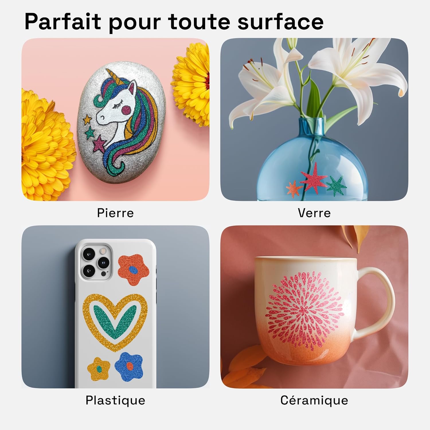 - Great for All Surfaces: Use these glitter paint pens as glitter fabric markers, metallic chalk pens, or glitter pens for glass. Glitter markers paint is good on almost all surfaces, like paper, rocks, stone, plastic, metal, wood, and more.