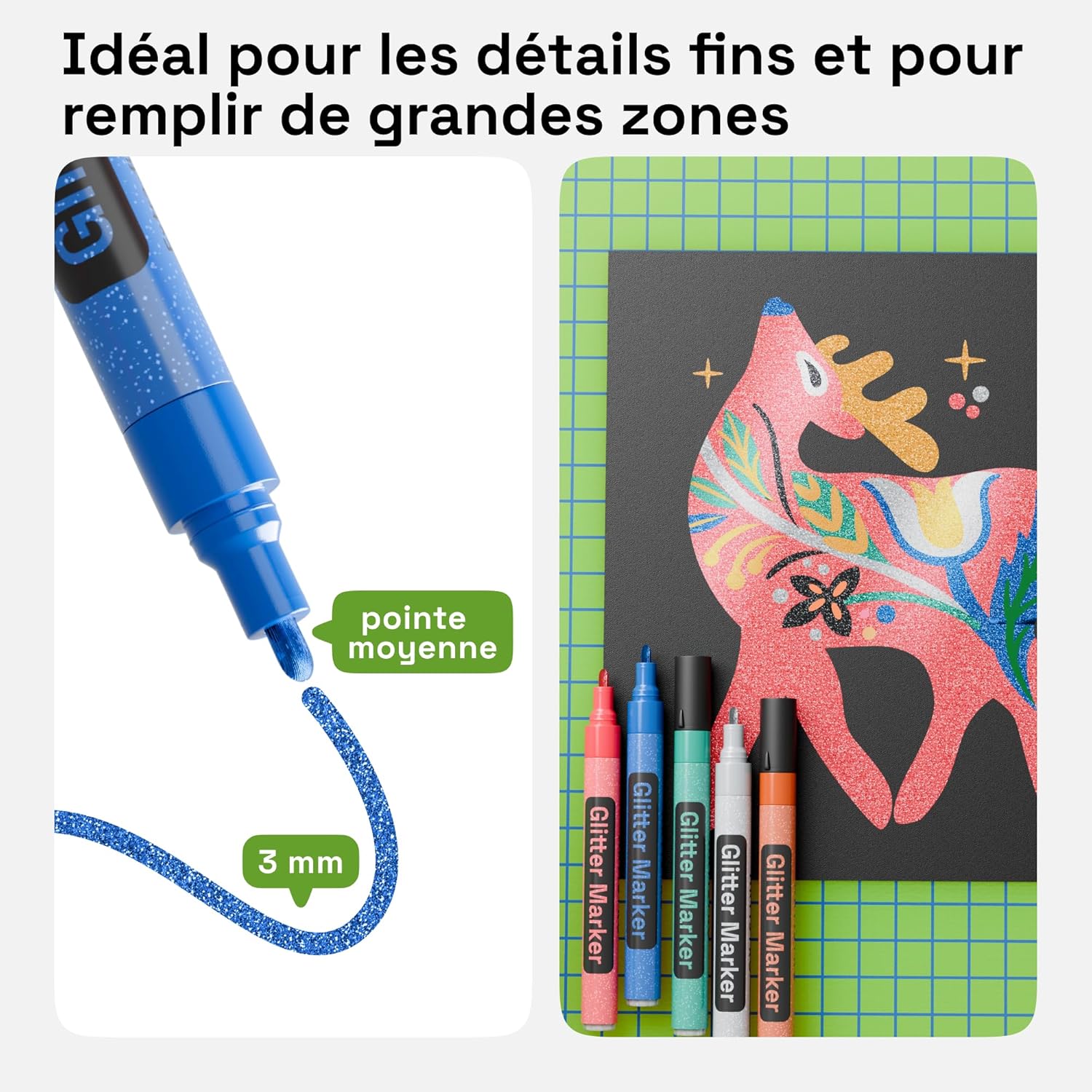 - 3mm Tip for Coloring: Make details with glitter marker pens fine point. Use the glitter paint pen or color glitter paint pens fine for outlines, lettering, and adding labels. Fine glitter markers are easy to activate.
