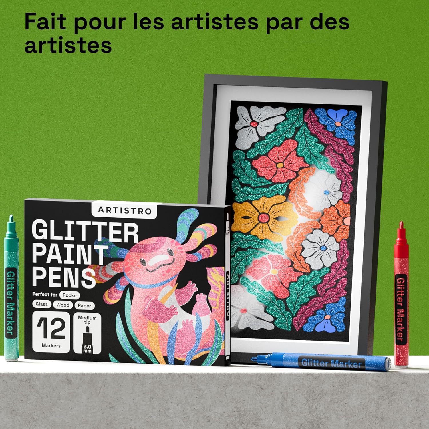 - Stunning Effect: Artistro glitter pens utilize vivid, acrylic ink that dries quickly to produce a very durable opaque and glossy finish on almost all surfaces. These glitter markers have a Japanese nib and Italian ink that’s water-resistant, heat-resistant, and flows without jamming or flooding.