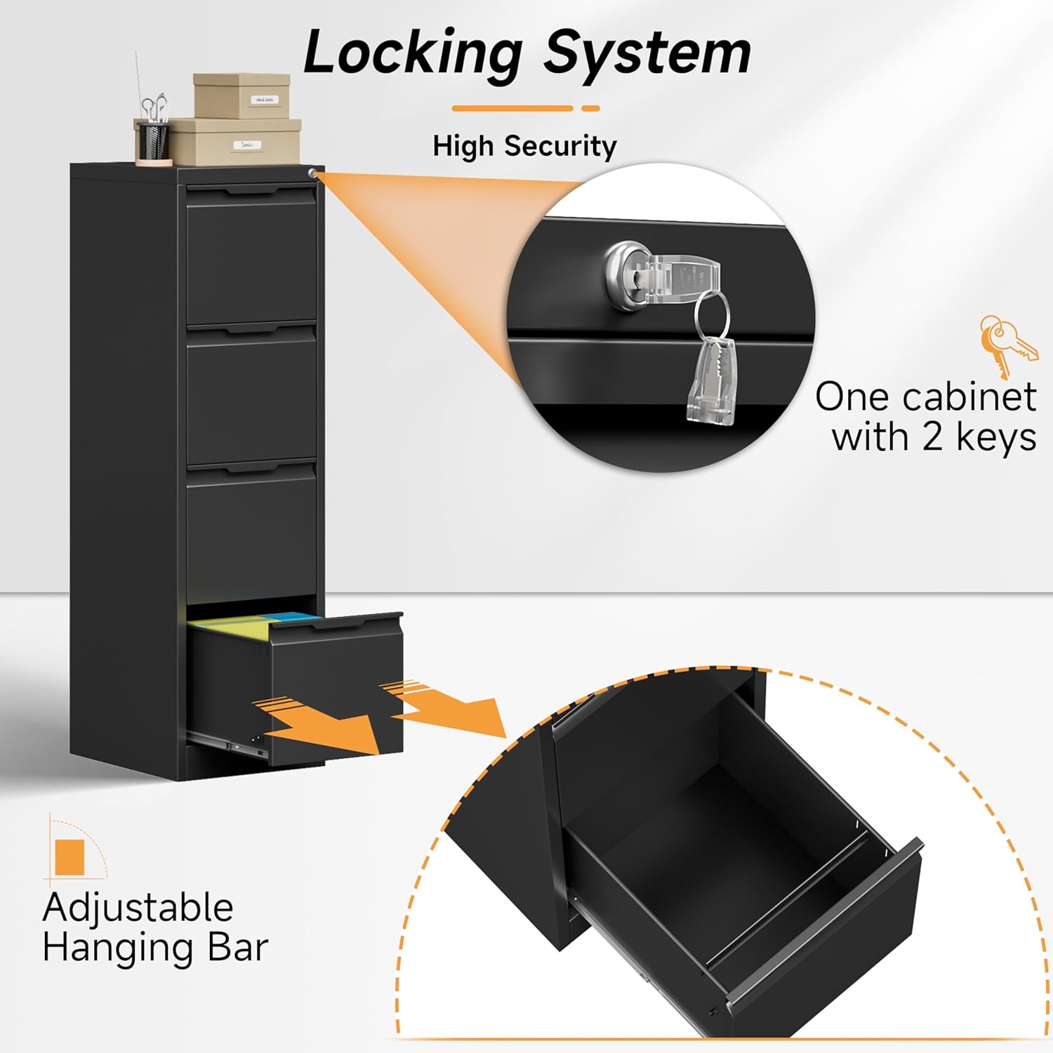 - đ§©ăSUPER FUNCTIONAL VERTICAL FILING CABINETă: Our this file cabinet has four large drawers with 15.7 inches depth, which provides you with large enough storage space. And it is equipped with adjustable hanging rods to store different types of files, such as letter, legal, A4, F4 size folders. It is perfect for you to customize the way you organize your files!