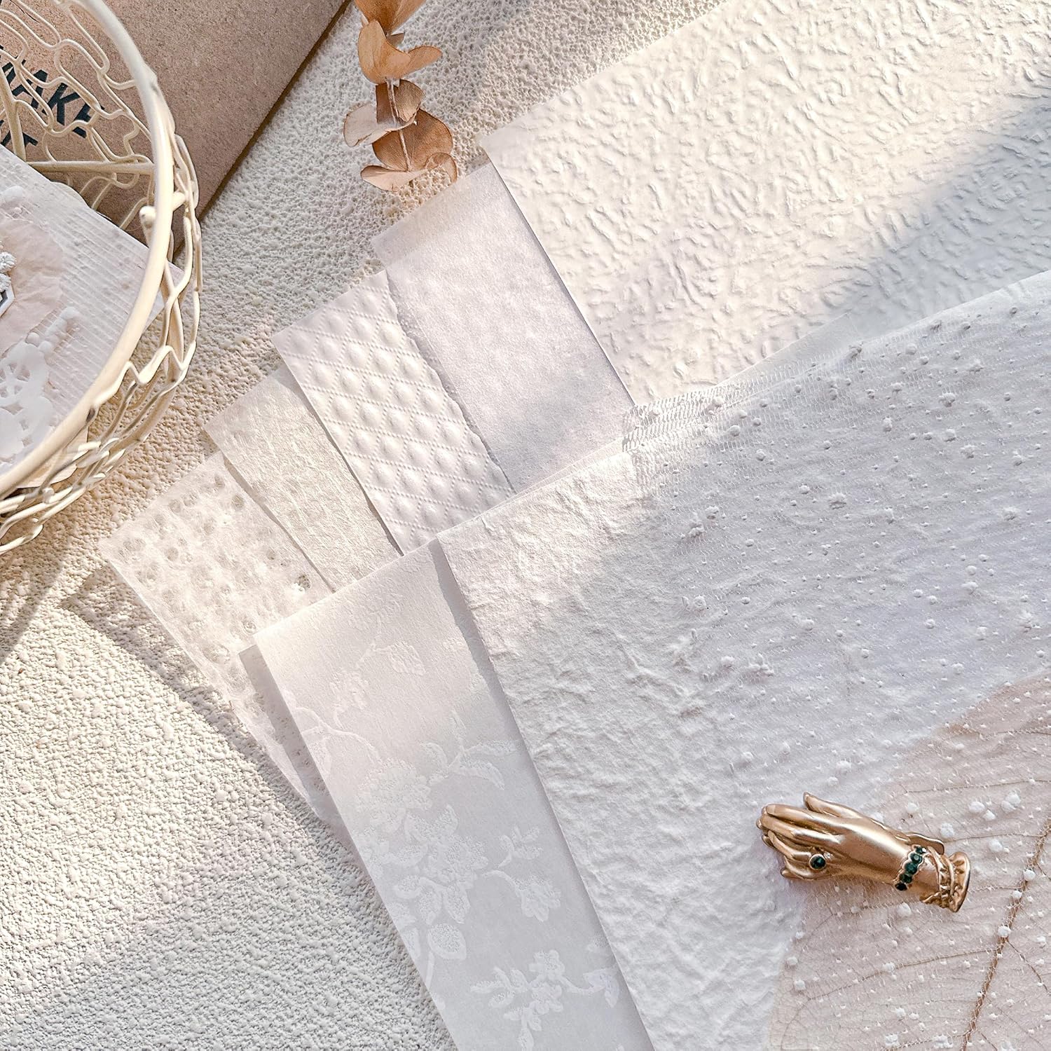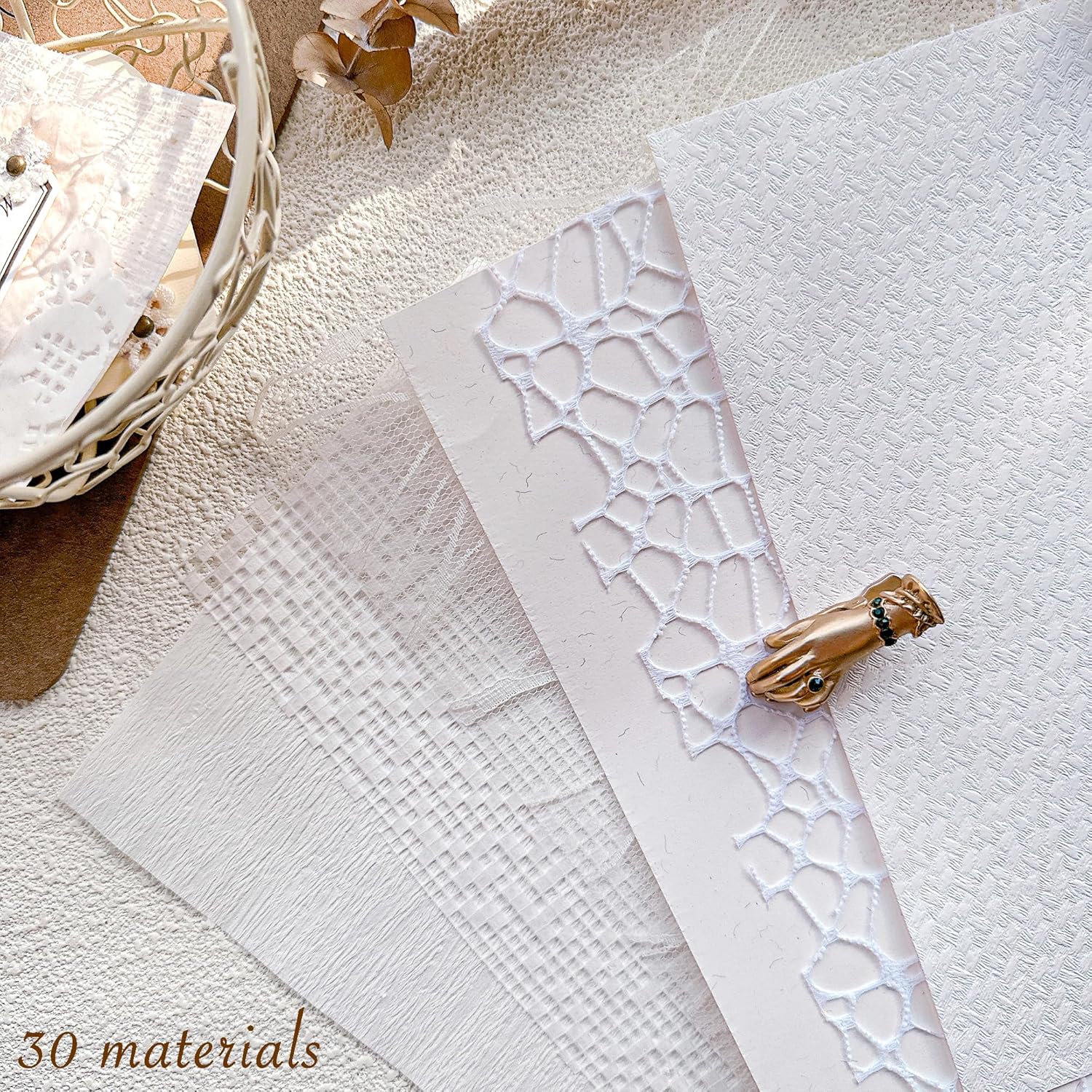 Aromoty 30 sheets Textured Scrapbook Paper&Mesh Fabric set - A4 Large Craft Mulberry Special Paper Mix for Scrapbooking White Junk Journal Supplies Card Materials Wedding Collage, 11.7x8.3 Inches