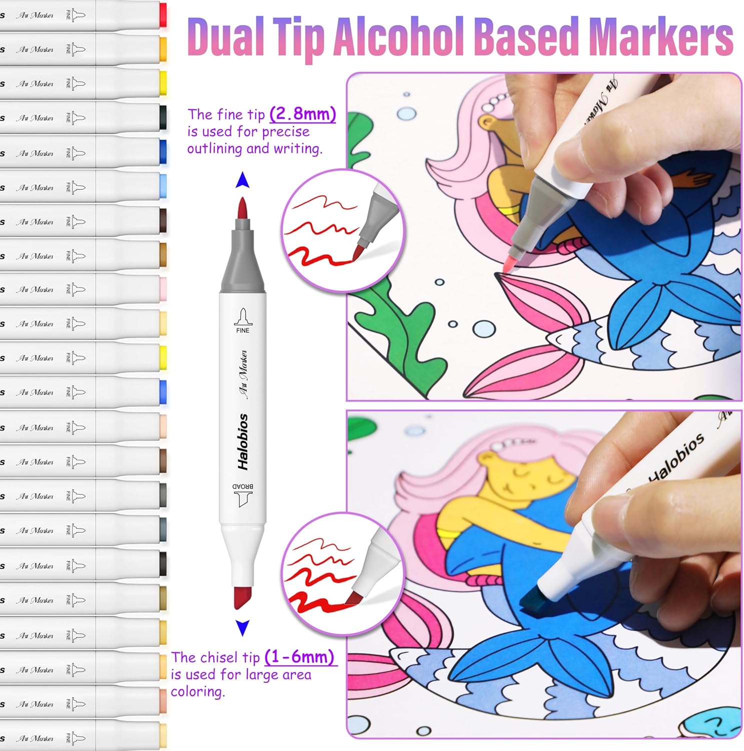 - ✐DUAL TIP ALCOHOL MARKER: The fine tip markers have a fine nib on one end for fine work or fine lines, and a broader chisel tip on the other end for filling in larger areas or creating thicker strokes. This dual tip design allows you to switch between a fine and broad tip for a variety of drawing and writing needs without having to change tips.