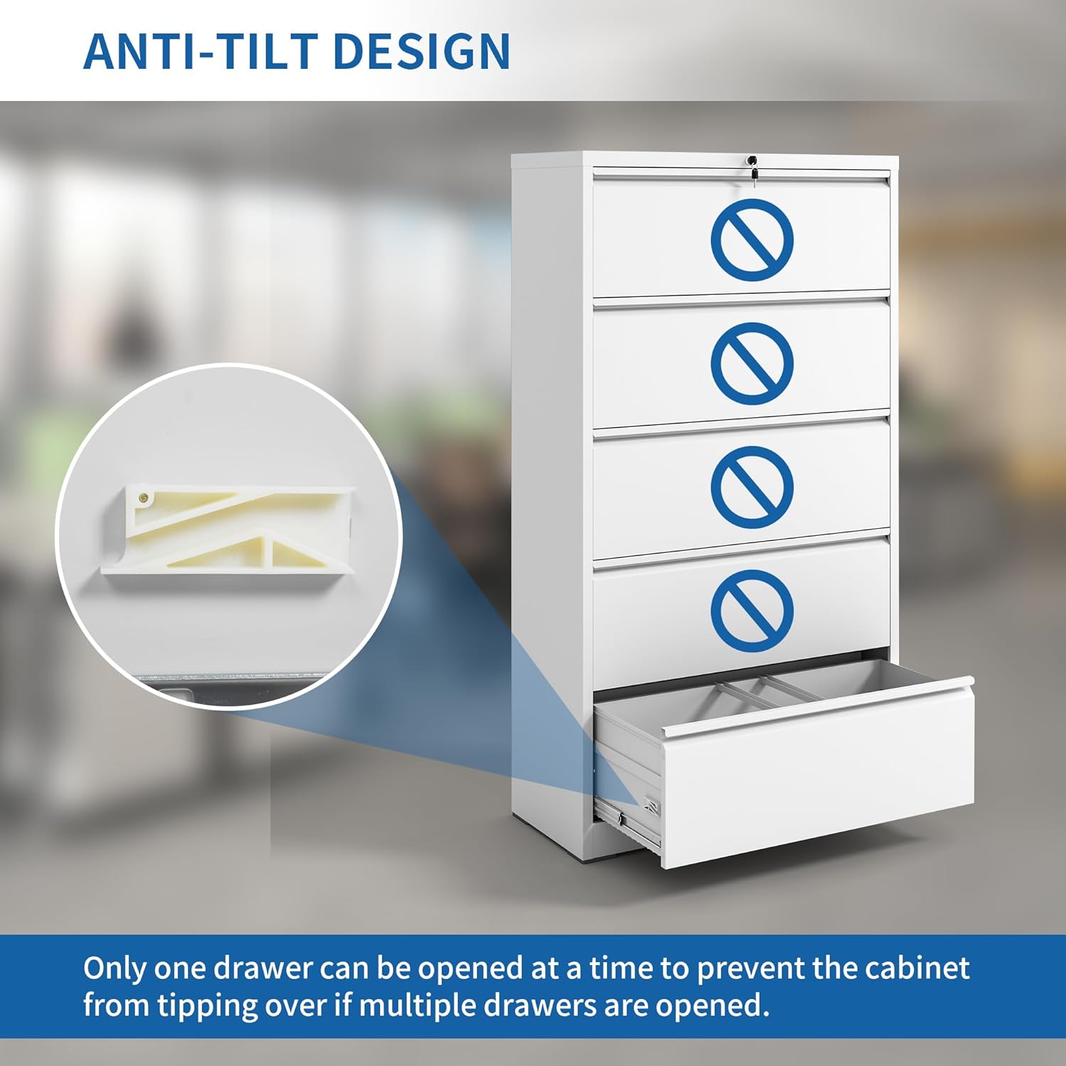 - ăAnti-tilt Systemă: This 5 drawer lateral file cabinet with lock meet your needs. It has has a anti-tilt design, ensuring that only one drawer can be open at a time. By preventing multiple drawers from being open simultaneously, the office cabinet maintains stability and greatly reduces the risk of tipping. You can have peace of mind knowing that your documents and equipment are secure.