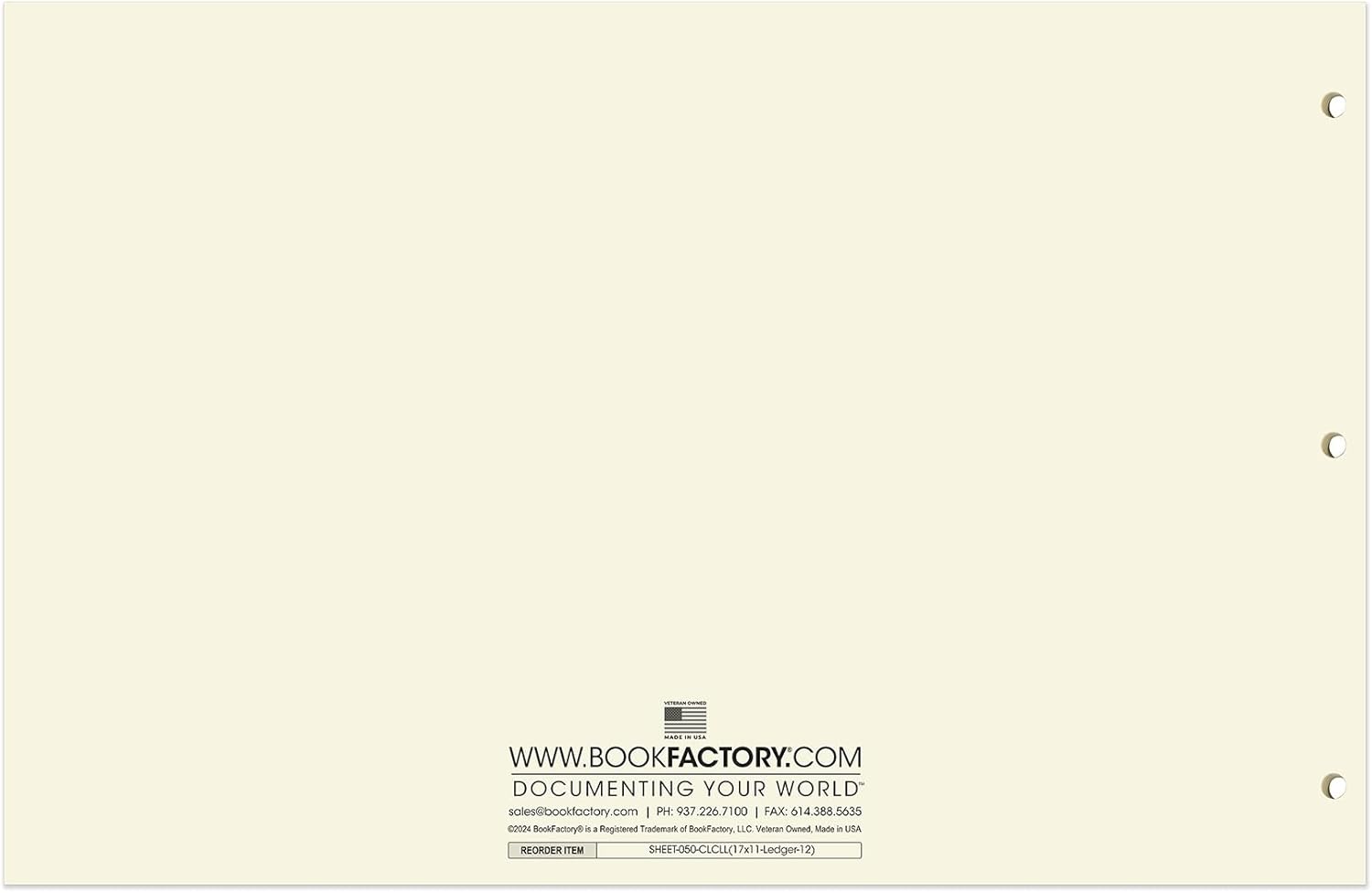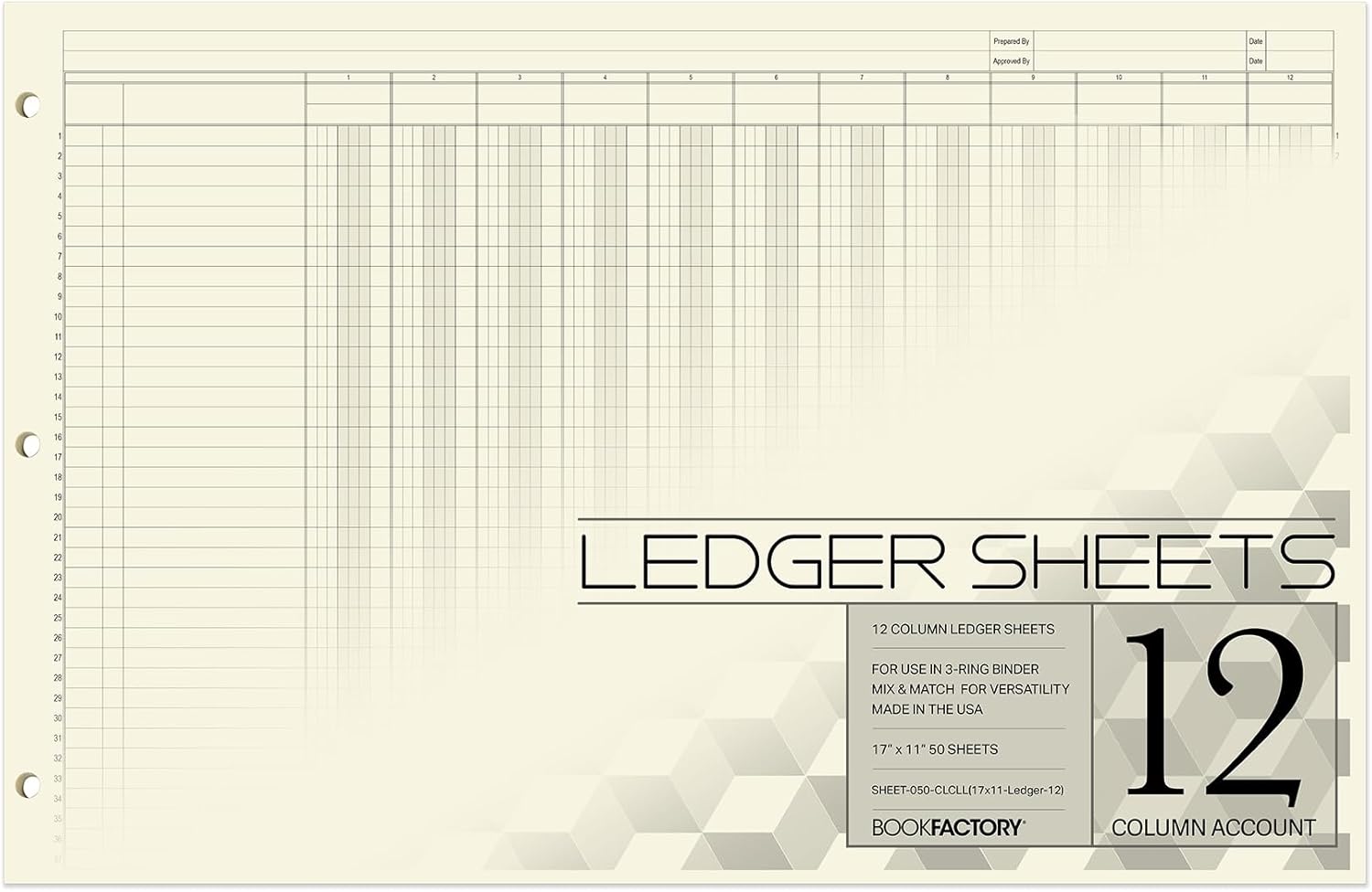 BookFactory Ledger Sheets/Large 12 Column Accounting Ledger Columnar (Twelve Columns) Loose Leaf Paper - 17'' x 11'', 50 Pages, Loose Leaf, 3 Hole Punched (SHEET-050-CLCLL(17x11-Ledger-12)-AX)