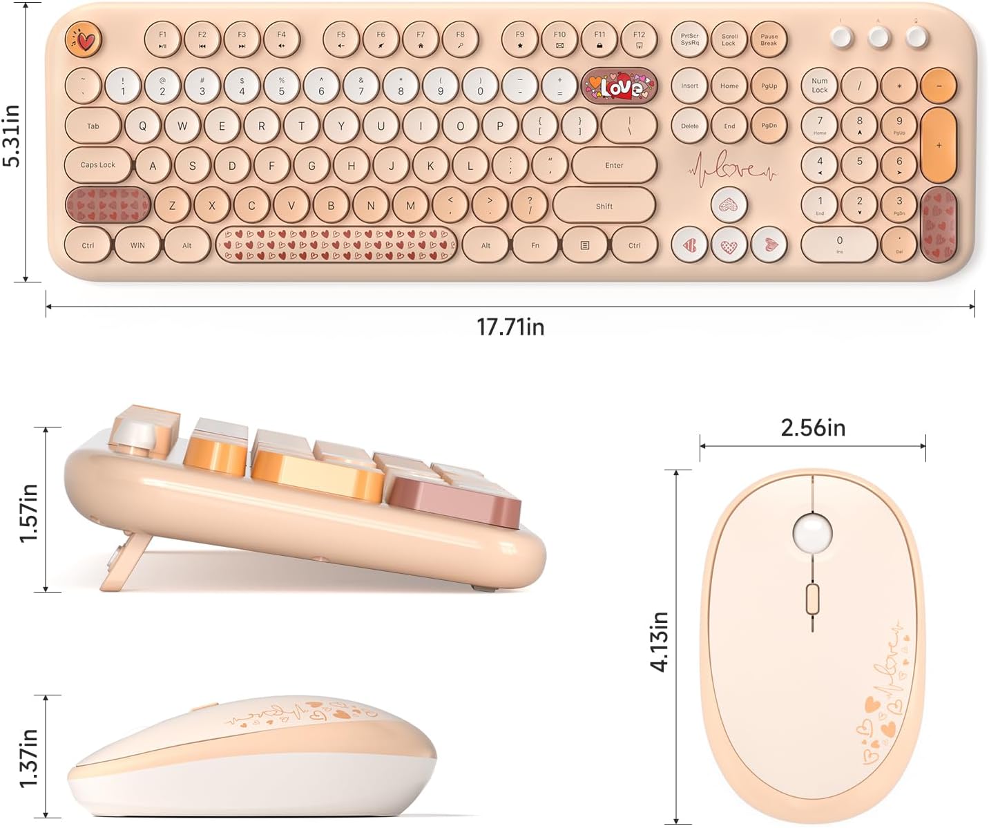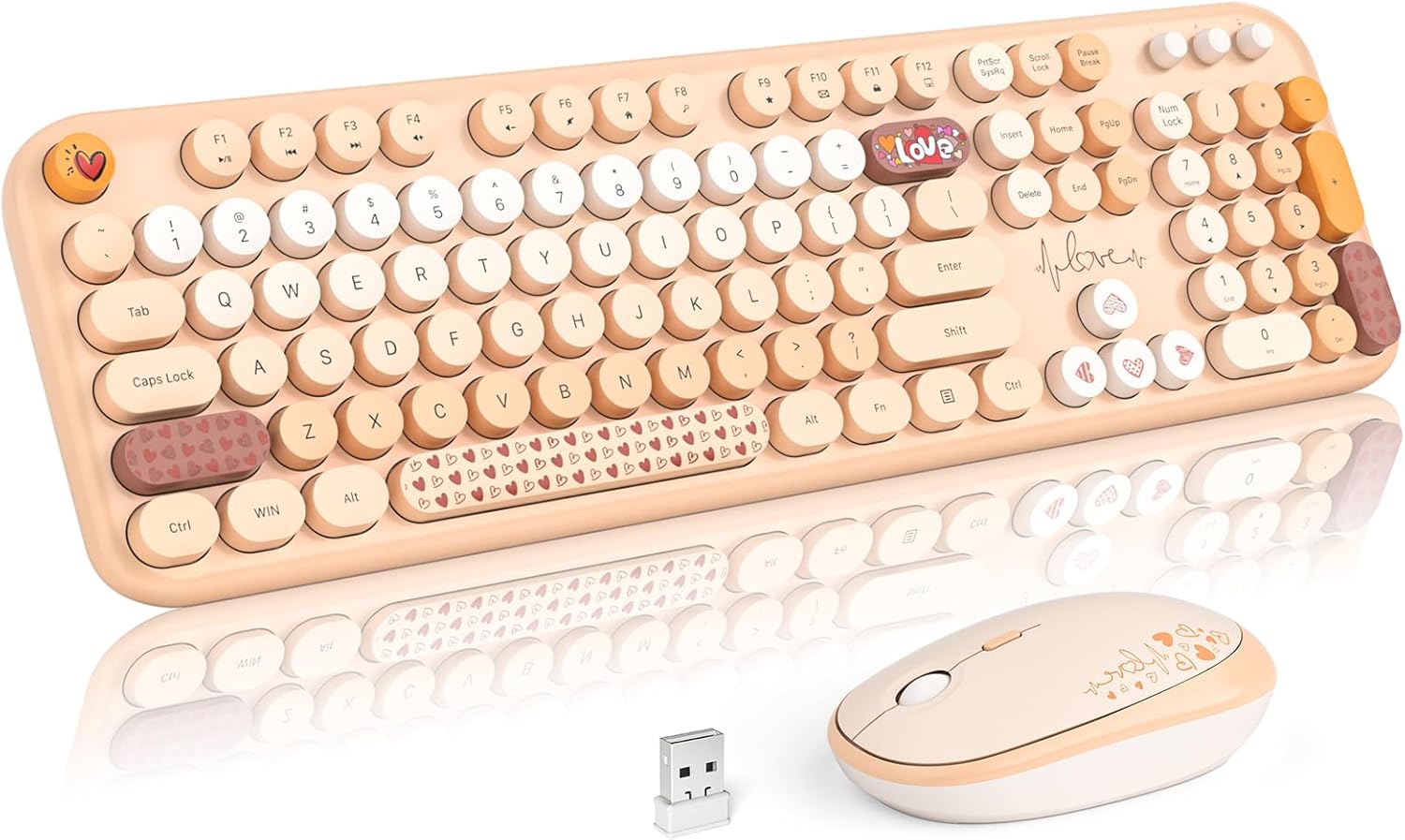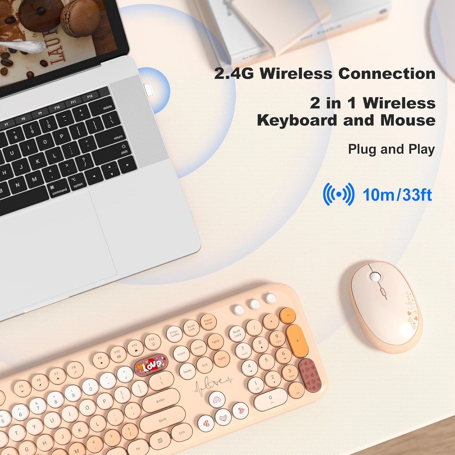 - Cute Wireless Keyboard and Mouse: Colorful aesthetic design retro typewriter keyboard with round keycaps, and with ergonomic foldable stand and anti-slip pad ensures comfortable typing. Quiet mice with 3 sensitivity levels (800/1200/1600) provides precise control.