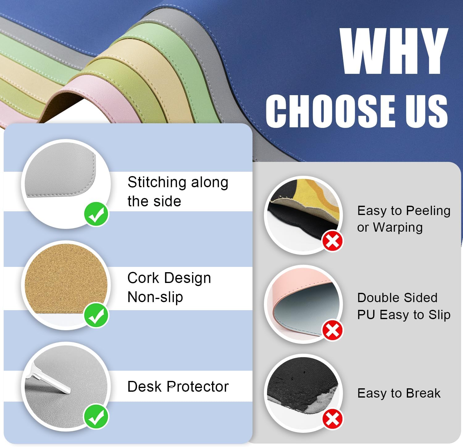 - 🖱️ 🖱️Superior Protection Mat for Desk: Durable PU leather and cork material, provide reliable protection for your desk surface. Safeguard your tabletop from everyday wear and tear with our Dual-Sided Desk Pad. This large mouse pad and desk mat combo is a protective barrier, preventing scratches, scuffs, and spills from damaging your workspace.