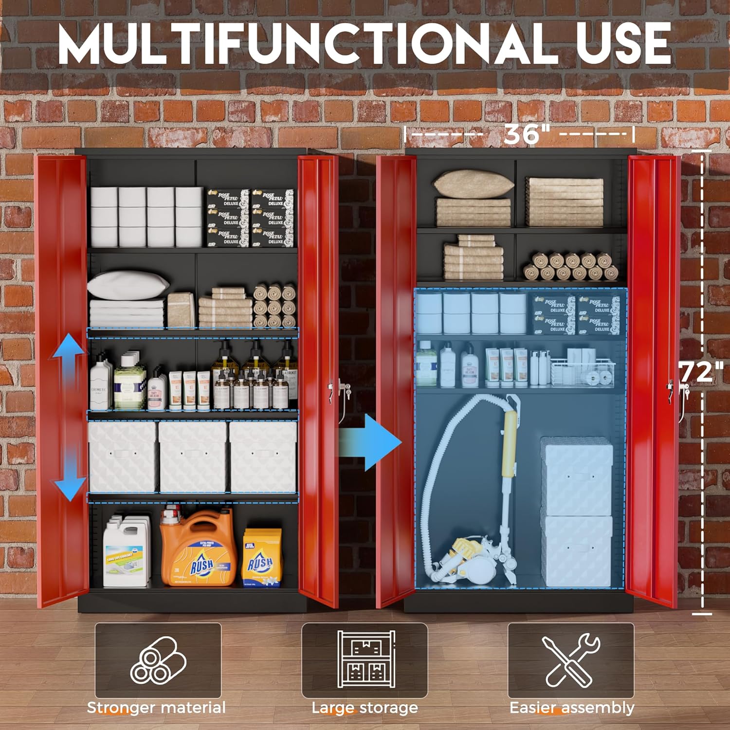 - 【Outstanding Quality】Greenvelly have devoted ourselves to the field of metal storage cabinet for more than 20 years, we know how to make excellent metal garage storage cabinet with doors and shelves, so we use cold rolled steel technology and 0.8mm steel plate. We reinforce each cabinet shelves with extra steel bars to prevent the divider from deformation and dents. During frequent use, the garage cabinet can still be in good condition.