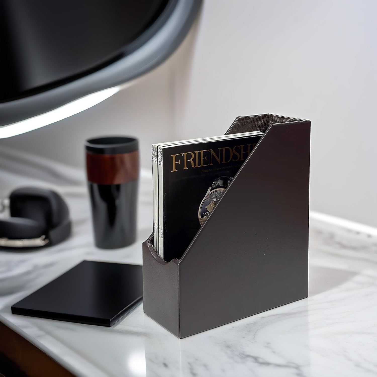 UnionBasic Magazine File Holder - Office Leatherette Desktop Document File Folder Journals Organizer Racks, Coffee, Set of 4