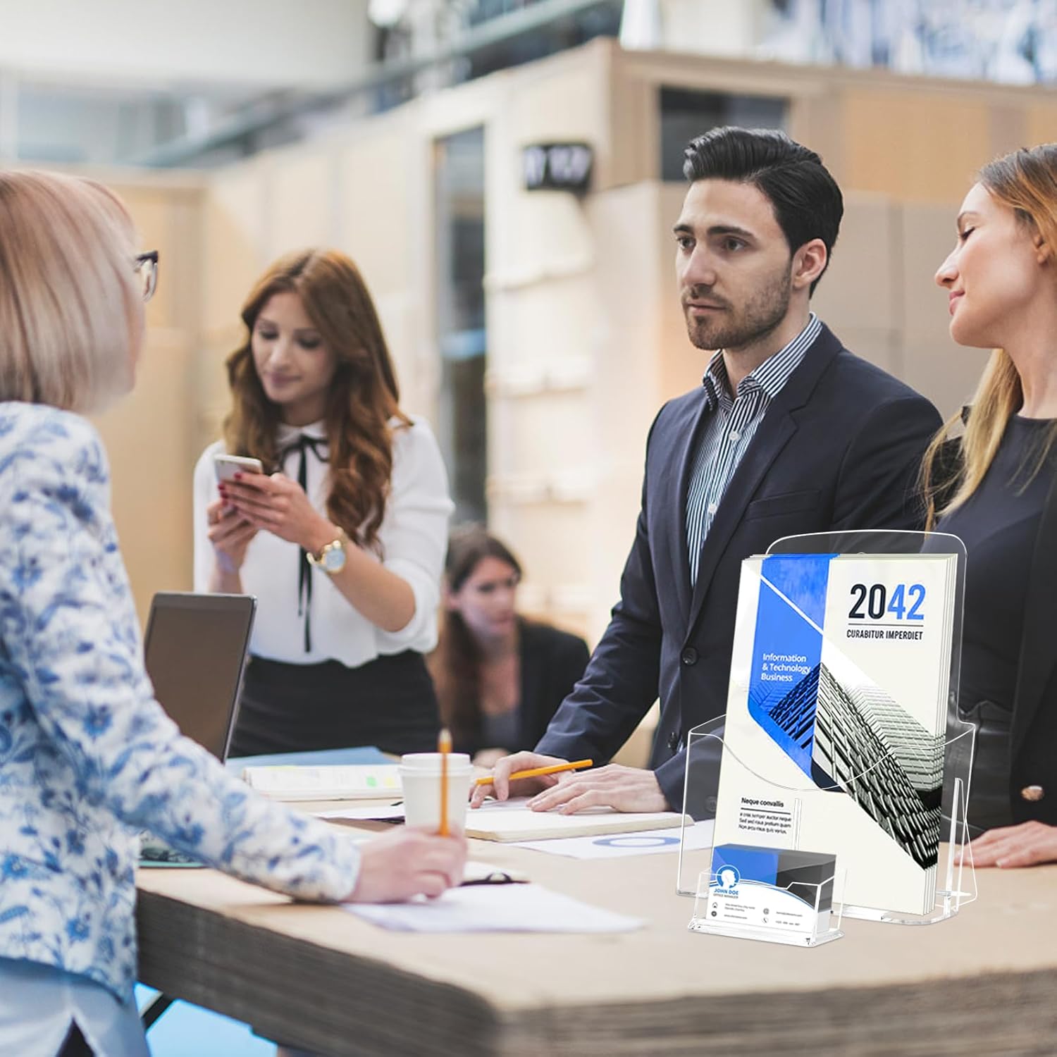 - 【1 Tier Flyer Holder】2 Pack acrylic brochure holder +2 Pack business card holder is ideal configuration for a brochure, pamphlet, and one sheet display stand for education, information, marketing, and sales