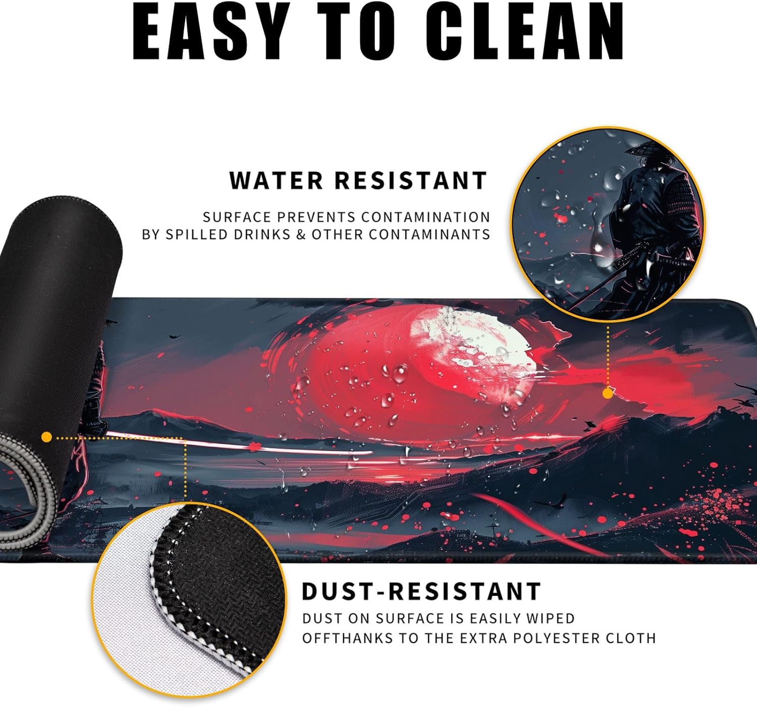 Black Desk Mat Japanese Samurai Mouse Pad XL Red Anime Big Mousepad Gaming Large Mouse Pad for Men Desk Pad with Stitched Edges Non-Slip Large Computer Mat, 31.5x11.8 in