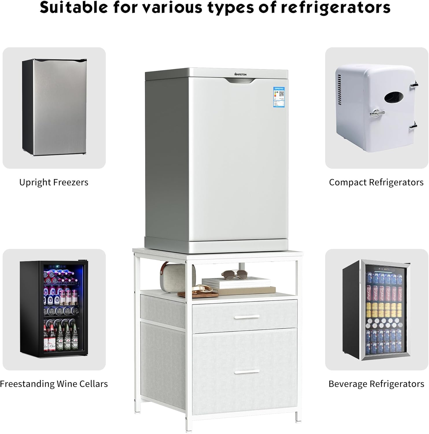 - Three-Tier Storage Design - This mini fridge stand features two fabric drawers (NOT WOOD) and one compartment, offering a total of three storage spaces to perfectly meet your various storage needs. It’s not just a mini fridge stand with storage; it’s also a great mini fridge organizer, helping you easily keep items around your fridge tidy and organized.