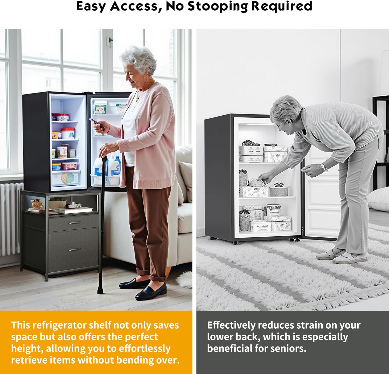 - Grab Items with Ease - This mini fridge stand is designed to reduce strain on your back and lower back, making it especially suitable for seniors. By elevating your fridge, you'll no longer need to bend over frequently to access items, making everyday use more comfortable and convenient.
