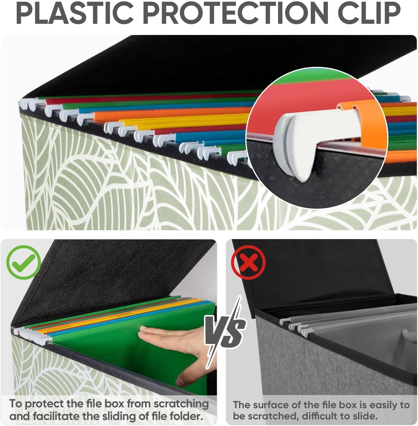 - [UNIVERSAL SIZE] Our file box with lid fits letter-sized files. It is designed for efficiency and functionality, with its smooth PVC slide rails on both sides, you can effortlessly slide file folders for easy access and neatly arranged. The lid fits snugly on the box after hanging folders. (NOTE: file folders are not included)