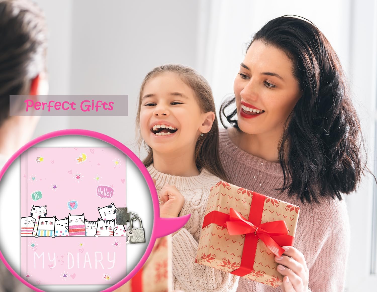 Cat Diary with Lock for Girls, 7x5.25 Inches 160 Lined Pages Secret Kids Diary Cute Cats Journal with Lock and Keys Notebook for Girls Birhtday Gifts for 5-10 Years Old