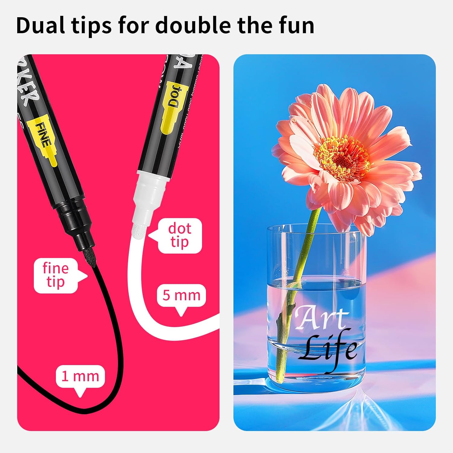 - DUAL TIP: Our rock painting pens come with a 1-5 mm dot tip and a 1 mm fine tip. Designed to give you the flexibility to switch effortlessly between fine lines and bold strokes, these paint pens acrylic markers expand your creative horizons and enhance the intricate details in your work.