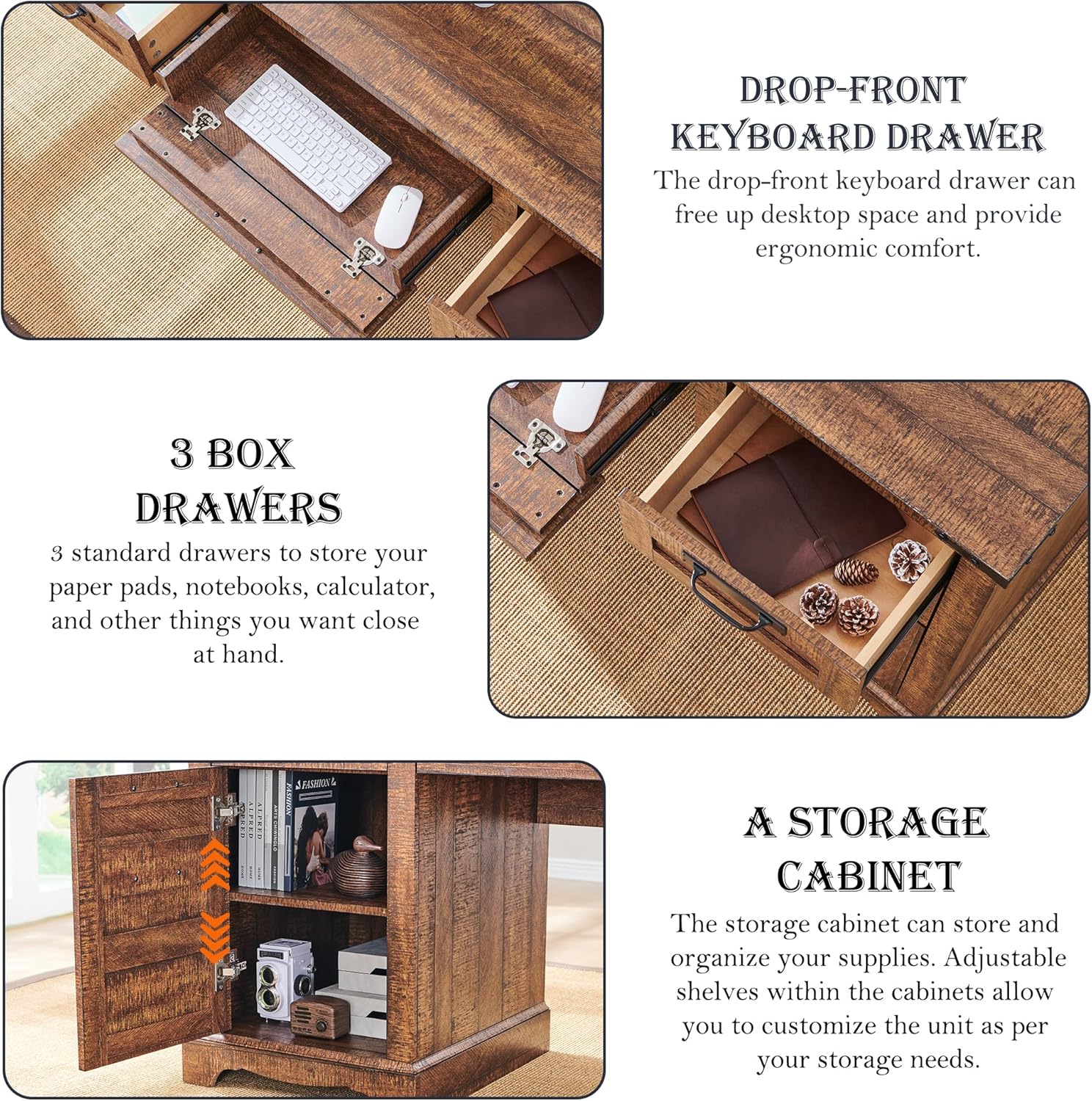 RedLemon 60" Farmhouse Executive Desk with Drawers, Wood Home Office Desk w/Charging Station, Keyboard Tray, File Drawer, Storage Cabinet, Rustic Computer Writing Desk (Reclaimed Barnwood)