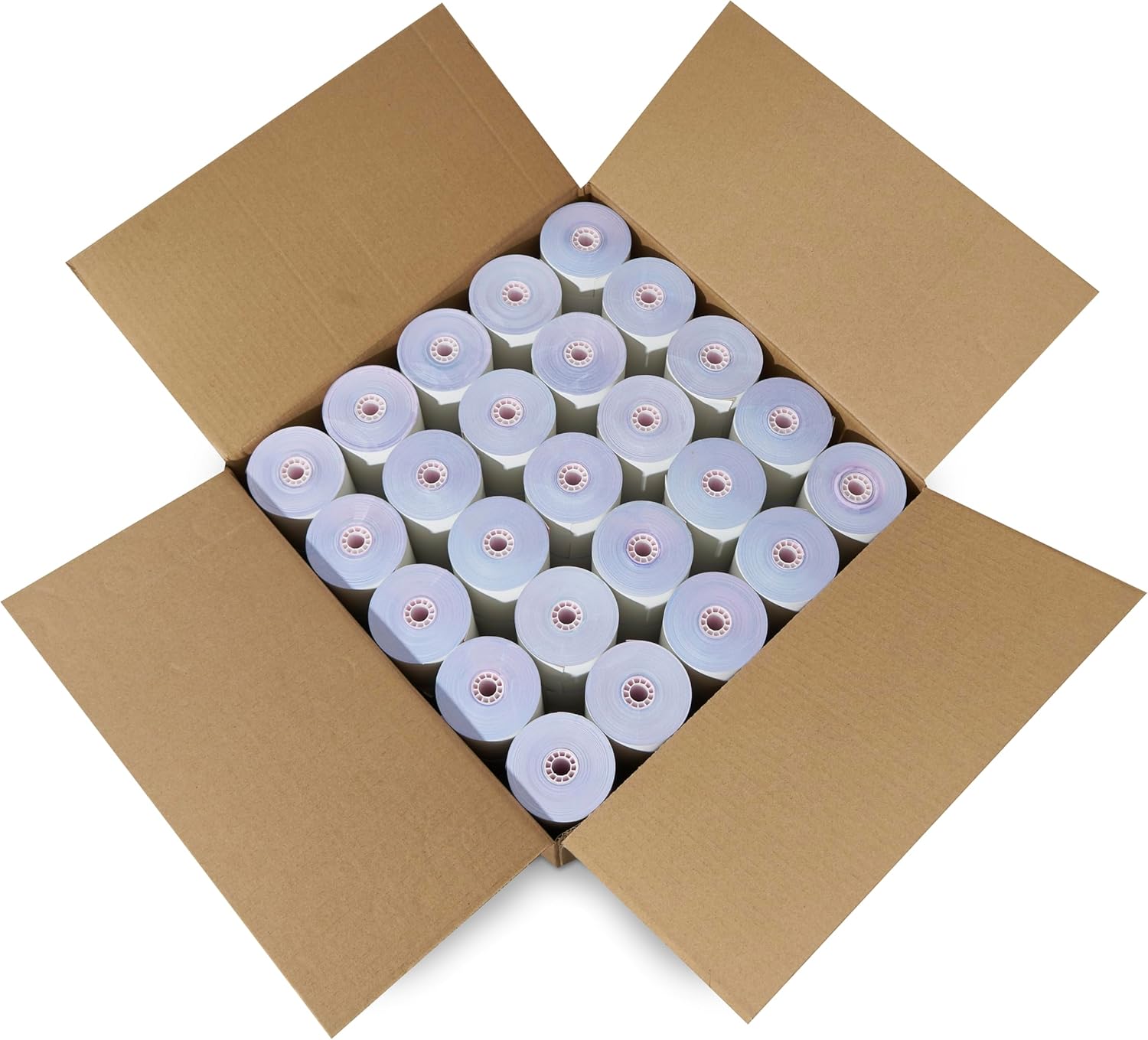 - " x 65' carbonless white/canary/pink bond paper is sold in cases of 50 rolls. Perfect for cash register receipt printers at any restaurant, retail store, or any other business. The most common 3 ply POS (point-of-sale) printer paper roll size. Fits most bond paper roll printers. Prints clear, crisp, easy-to-read sales receipts. All of our quality manufactured, precision cut, receipt paper rolls are BPA free and meet all printer manufacturers OEM (Original Equipment Manufacturer) requirements.