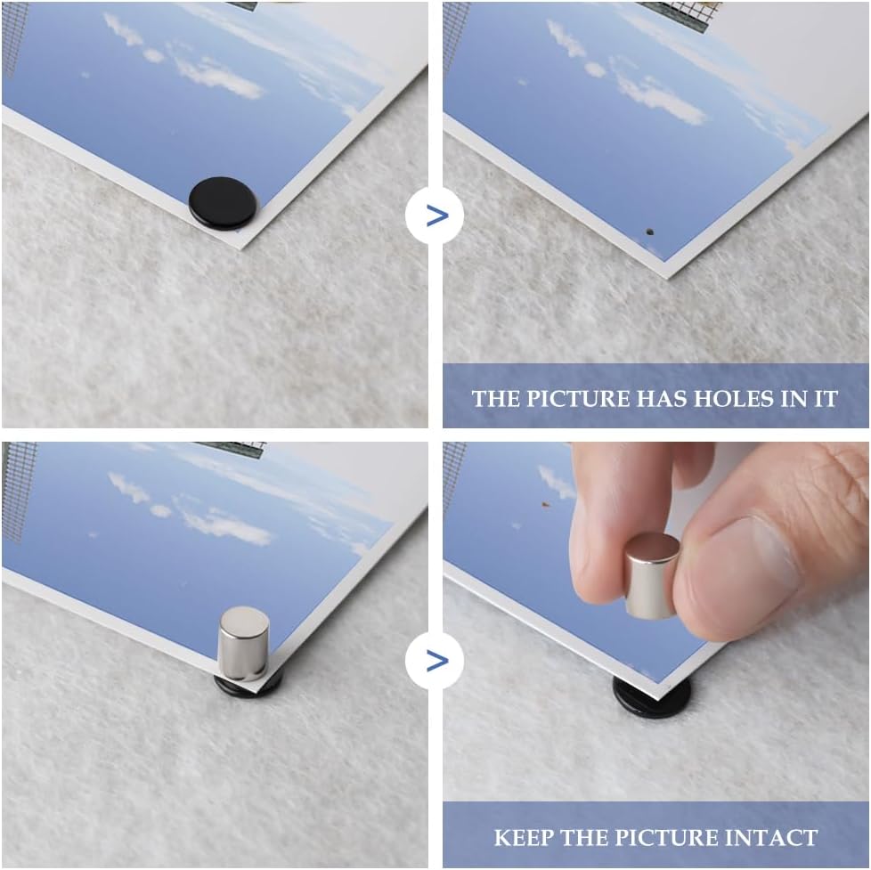 - 【Easy to Use】You just push the pins into the wall with your hands, next position your photo, poster etc. that you want to hang, then hang your item by attaching the magnet to the outside