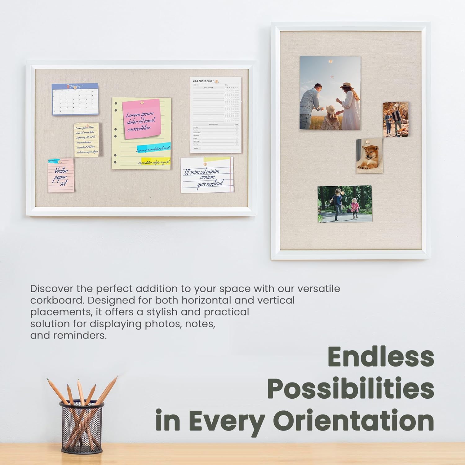 - Premium Solid Wood Frame: Cork board with a solid wood frame measuring 1.38" in width. This sturdy construction ensures durability and longevity, providing a reliable display solution for your photos, notes, and reminders. Its elegant design adds a touch of sophistication to any space, making it a versatile and stylish addition to your home or office decor.