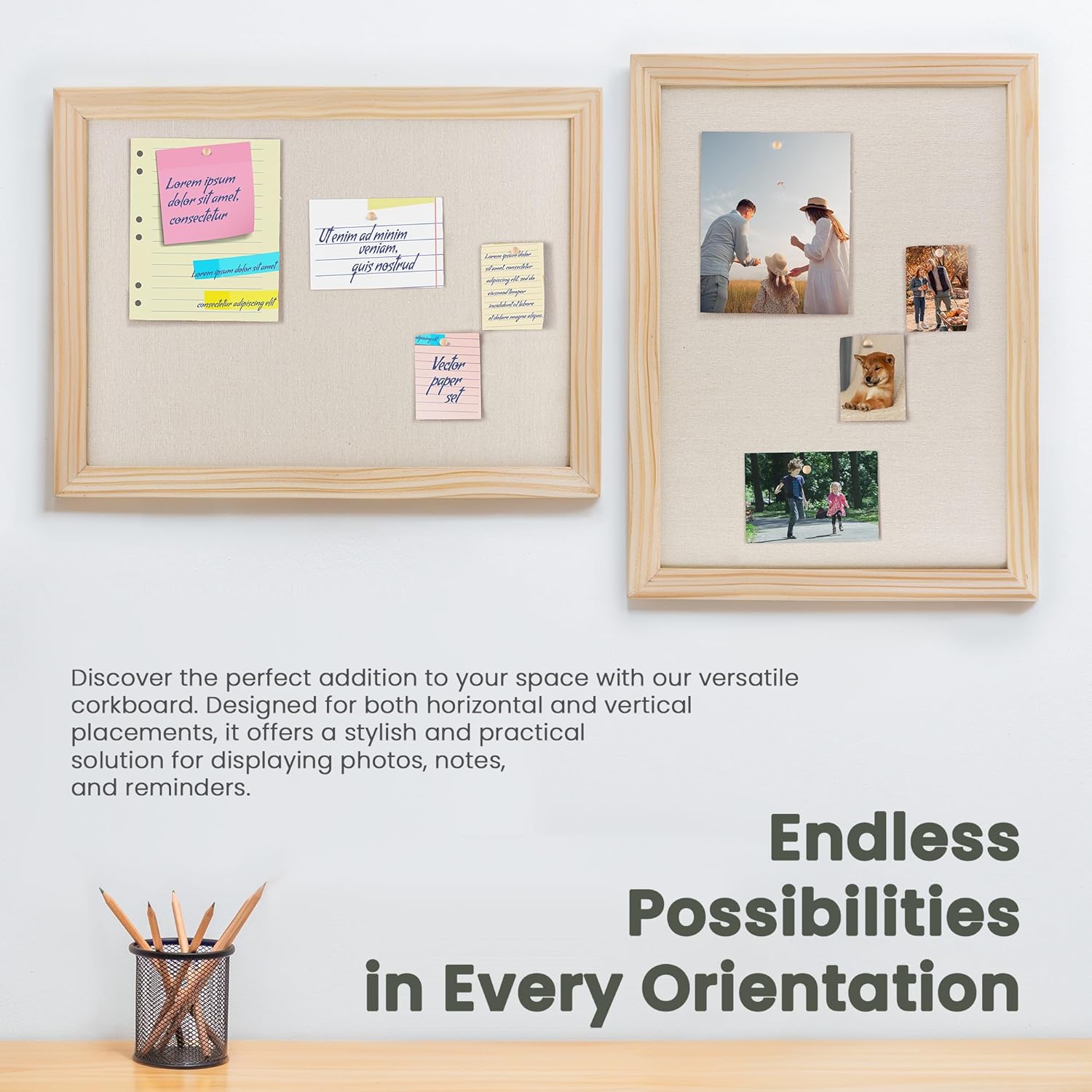 - Premium Solid Wood Frame: Cork board with a solid wood frame measuring 1.38" in width. This sturdy construction ensures durability and longevity, providing a reliable display solution for your photos, notes, and reminders. Its elegant design adds a touch of sophistication to any space, making it a versatile and stylish addition to your home or office decor.