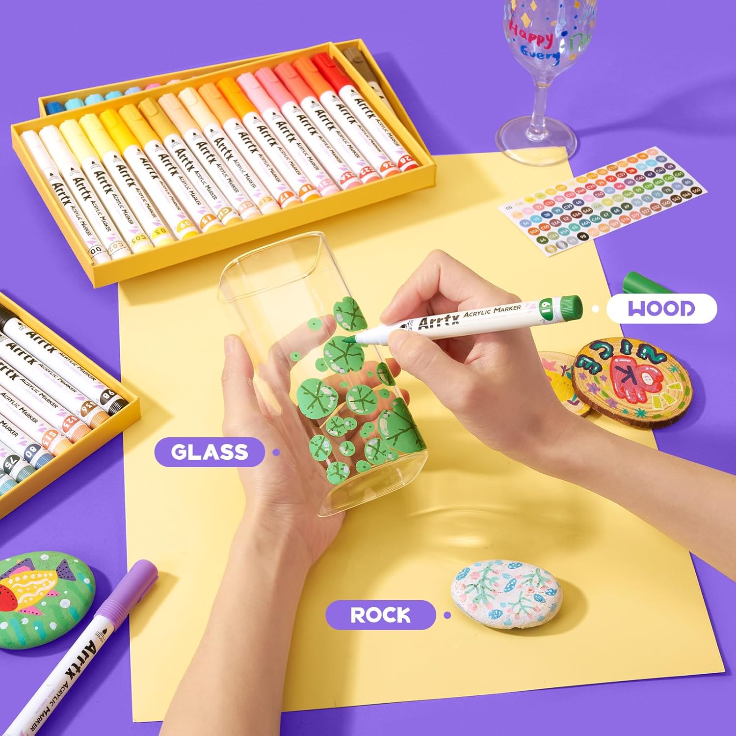 - Suitable for Multiple Surfaces: Arrtx acrylic markers set provides water-based smooth ink and excellent coverage for a variety of surfaces, works for paper, cardstock, metal, rock painting, wood, plastic, canvas, fabric, stone, Easter eggs, easter decoration, metal, Christmas ornament, Halloween pumpkin painting, calligraphy, scrapbook, brush lettering, Christmas card, birthday gifts, greeting card, or any DIY crafts projects and more. Let's express imagination!