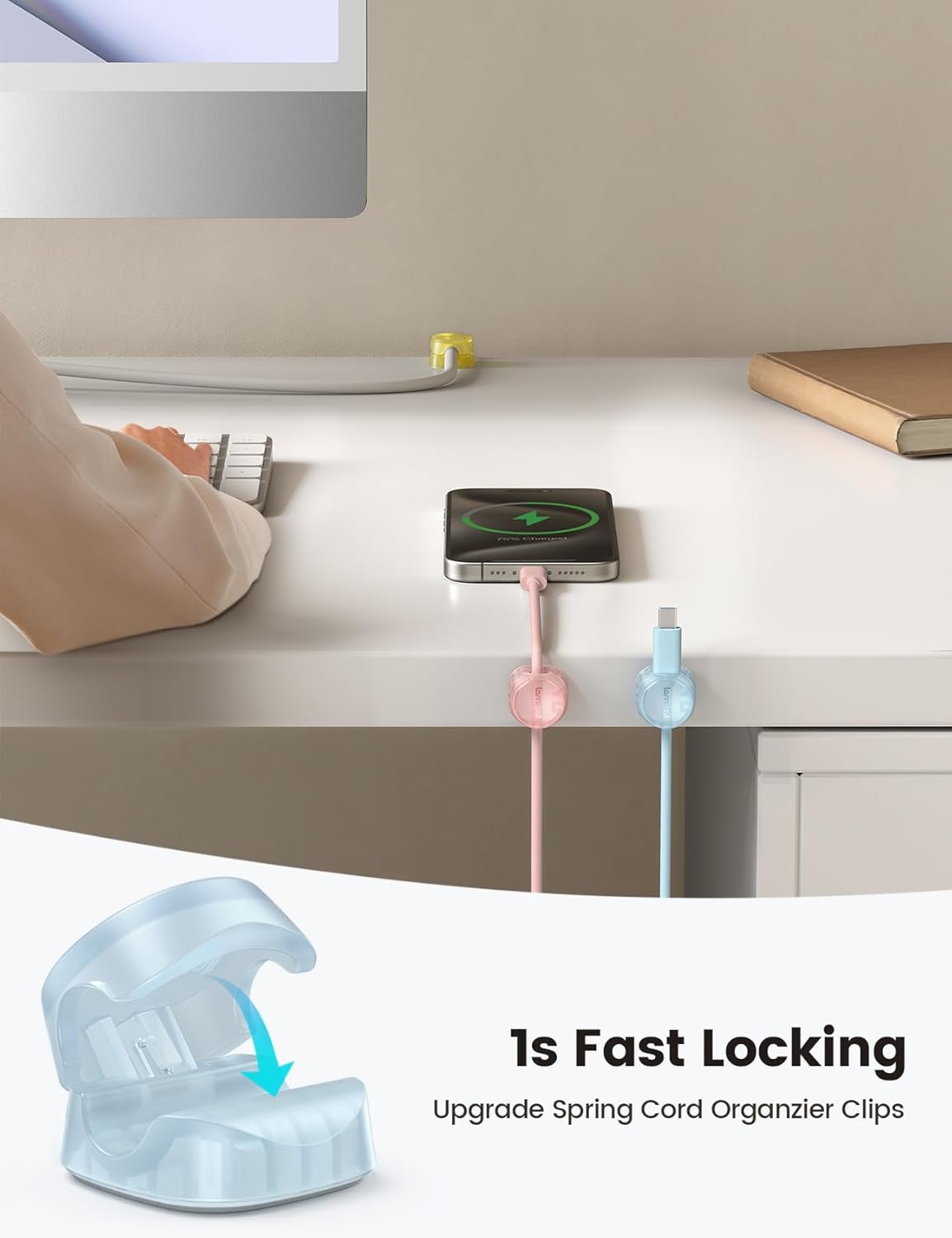 - Spring Locking Design : Our cord holder clips feature an innovative spring open-close mechanism, combine with the unique design of the spring's 60Β° rotation shaft and thoughtful angled opening. This cord holder organizer allow you to place and remove your phone charging cords, HDMI cords, household wires qucikly and securely with just one hand. [Installtion Tips] After sticking the cord holders, please WAIT for 30 minutes before using for better adhering effect