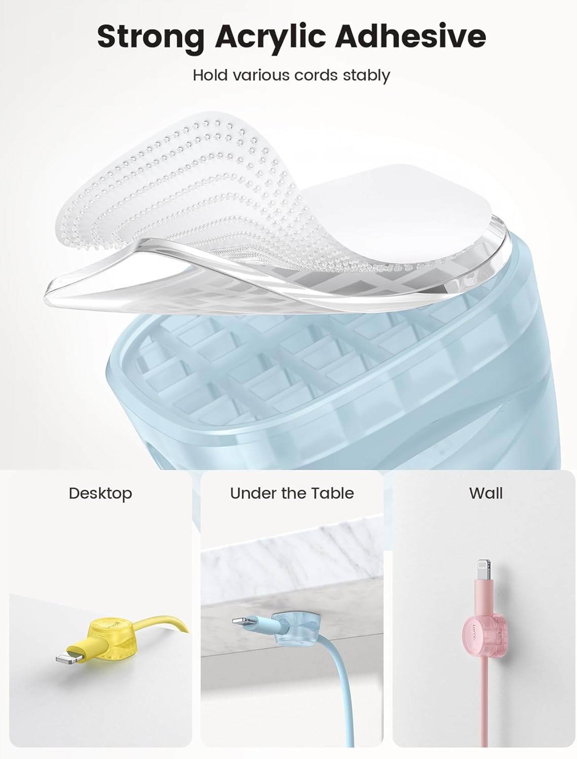 - No-Residue Acrylic Adhesive : Unlike ordinary 3M adhesive tapes, our cable holder organizer utilizes the acrylic adhesive that is stronger and leaves no residue when removed. Just simply stick the wire holder organizer to any smooth and dry surface, such as wooden table, glass, or ceramic tiles, etc. The clear adhesive pads won't damage your desk, nightstand or walls