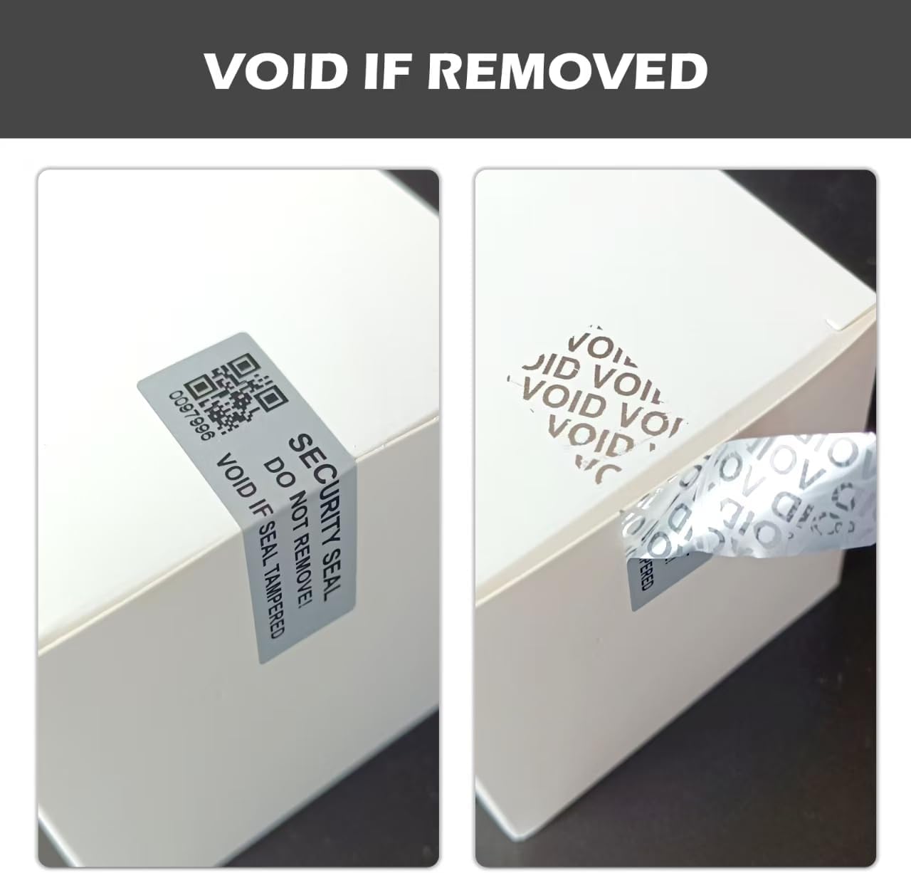 - Dual Protection -- With dual unique security seal number (bar code) for product security identification and inventory. Has “VOID” marks.