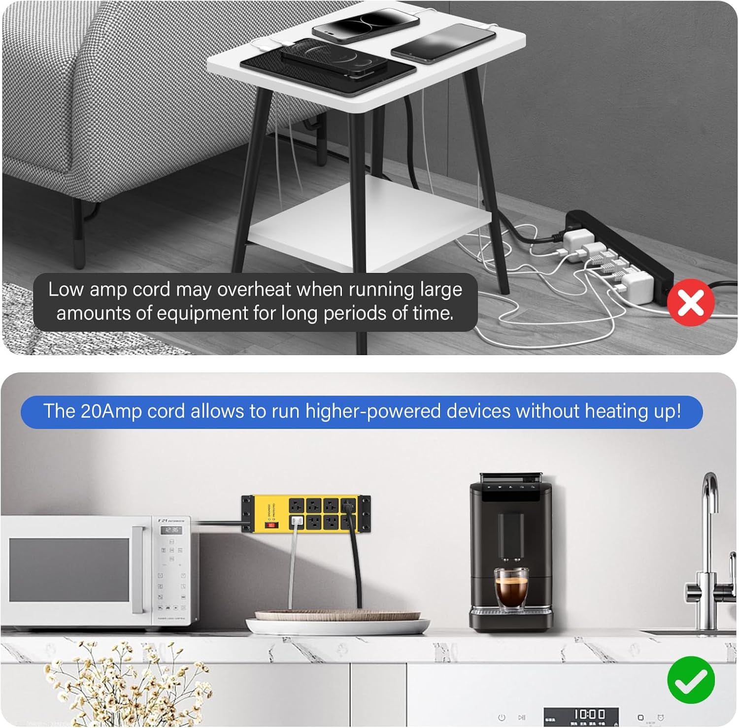 - With 12awg 5-15P extension cord, 6-20R T-Slot adapter for more appliance. Can plug it into a 15A or 20A outlets, if you are using it in a 15A system, do not exceed 1875W.