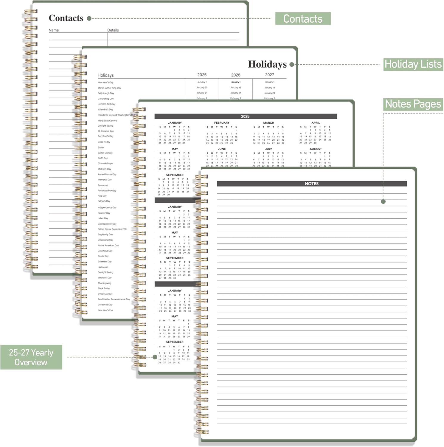 - 2025 Appointment Planner - Spanning from Jan 2025 - Dec 2025, is designed to help you manage your life and enhance your work efficiency. It features an annual overview calendar for 2025, a contact page, a holiday page, monthly calendar sections for each of the 12 months, 53 weekly calendar sections with space for notes, and an annual review section. These elements combine to provide a comprehensive organizational tool.